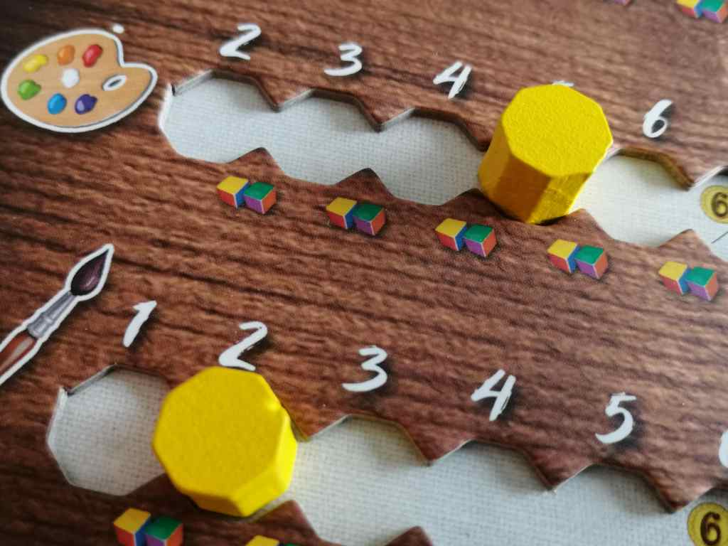👍 La roue d’action et « l’abandon » d’un peintre d’un tour à l’autre sur celle-ci, mettant l’anticipation au cœur du système du jeu