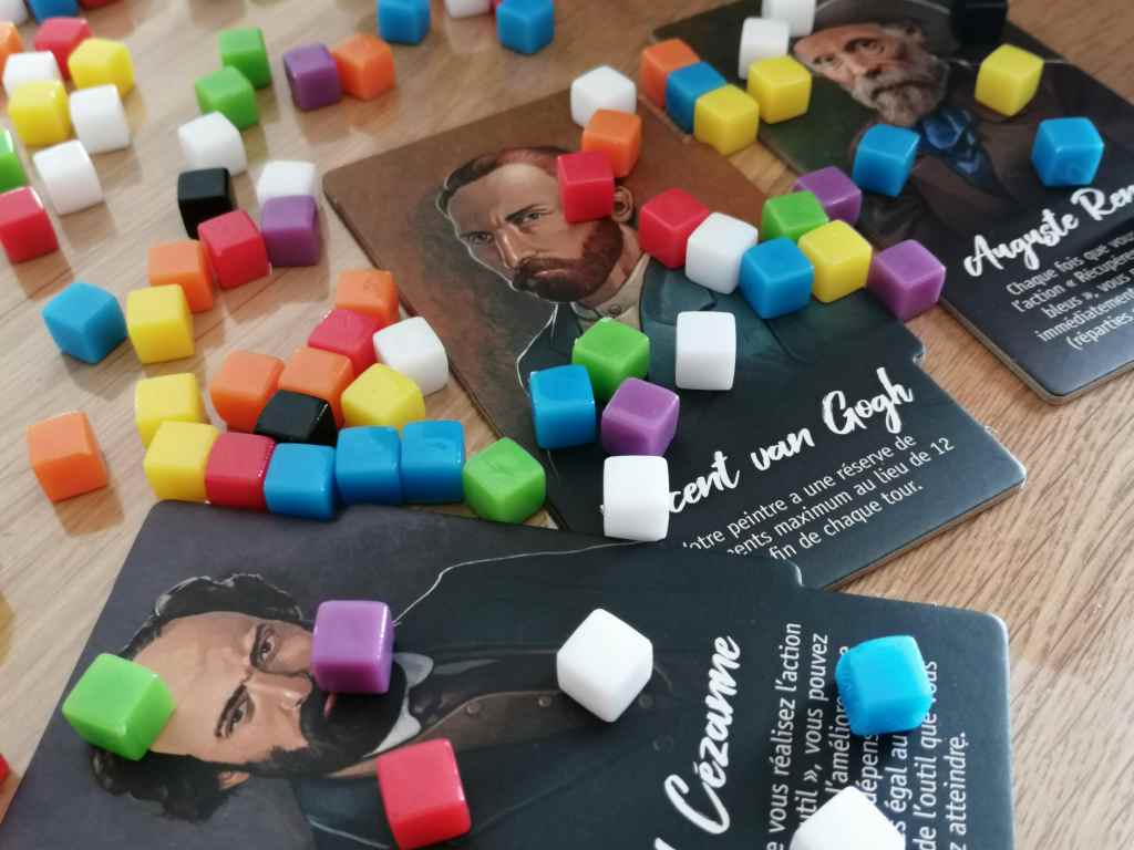 A votre tour, poser un de vos peintres sur la roue d’action. Attention, les places sont limitées. Une fois tous les peintres posés, chaque joueur effectue l’ensemble de ses actions dans l’ordre de son choix : récupérer des couleurs, améliorer vos capacités ou peignez. Enfin, la roue tourne et vous devez laissez un peintre sur place, que cela vous plaise ou non ! Lorsqu’un joueur a peint deux tableaux, la partie prend fin et le joueur ayant le plus de points de victoire est déclaré vainqueur !
