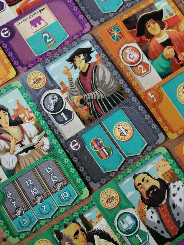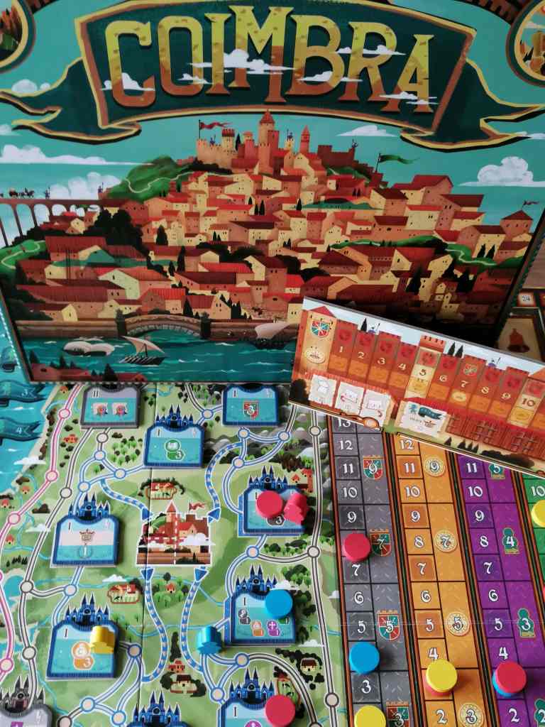 COIMBRA est un jeu complexe, très complexe, du genre à hésiter un temps infini pour juste choisir un dé. Ce seul petit dé va déterminer votre ordre du tour pour acheter une carte, quelle carte vous allez acheter, son prix, sa monnaie, et vos revenus en fin de manche… Cette mécanique est juste géniale. Tout est parfaitement lié et imbriqué. C’est parfait. Moi qui aime les jeux de dés originaux et intelligents, je suis servie. Oui mais voilà, je ne suis pas rentrée dans l’histoire, le thème prétexte, les joueurs fictifs, et le décompte très long en fin de partie m’ont déçue. Je n’ai pas pris le plaisir ludique que j’espérais. J’attendais beaucoup de COIMBRA, peut être trop, mais il faut bien admettre que dans la même catégorie je lui préfère « Lorenzo il Magnifico » ou « Teotihuacan« . Il n’en reste pas moins un excellent jeu de gestion dés / ressources / cartes très tendu, intelligent, aux mécanismes innovants et aux graphismes très plaisants.