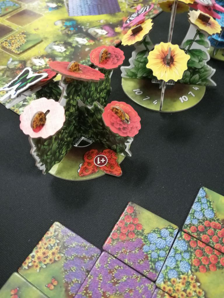 Enchérissez le plus de chenilles pour choisir en premier une ligne ou une colonne de tuiles vous permettant de constituer des parterres de fleurs. Chaque parterre terminé vous permet de poser un papillon sur l’arbre de la couleur de votre parterre afin de remporter des points de majorité en fin de partie.