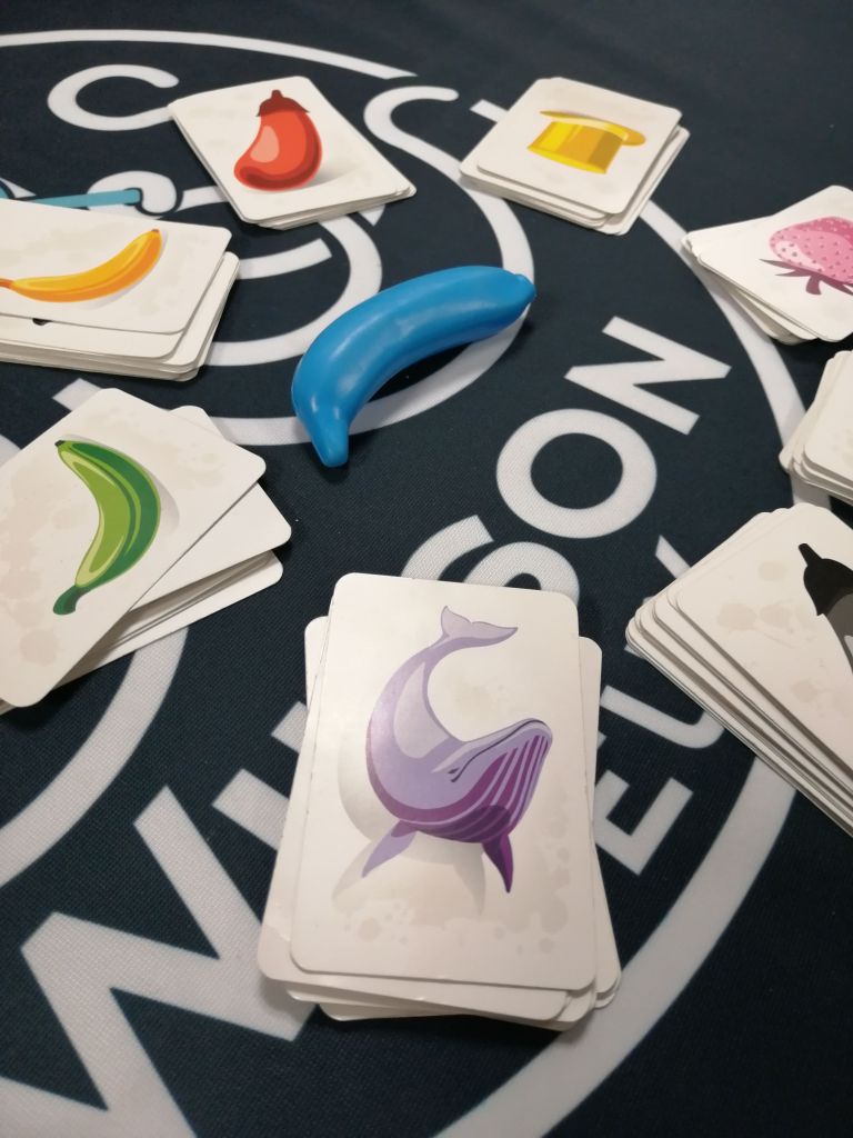 Trouver le plus rapidement possible les cartes au dessus des 8 paquets autour de la banane bleue correspondant aux éléments figurant sur deux cartes de « consignes ». Prenons l’exemple d’une carte indiquant une « aubergine rouge ». Une aubergine est naturellement violette, et le rouge se rapporte à la couleur de la fraise. Jetons nous donc sur les cartes « fraises » et « violettes »… Si toutes les cartes sont trouvées, il faut s’emparer de la banane bleue pour mettre fin à la manche.