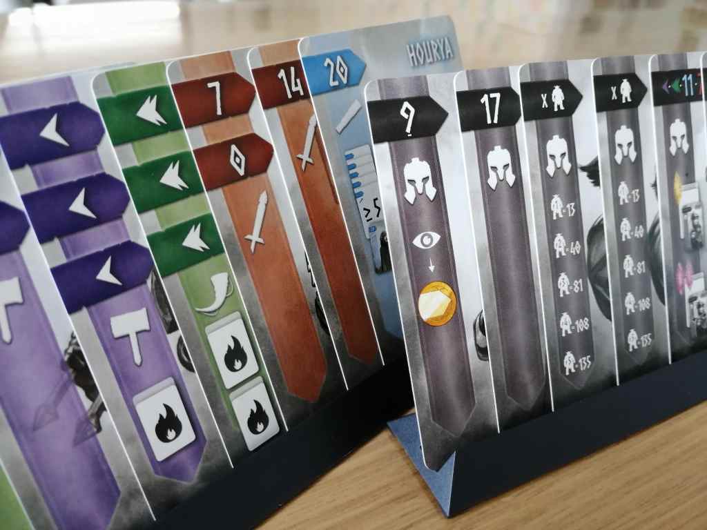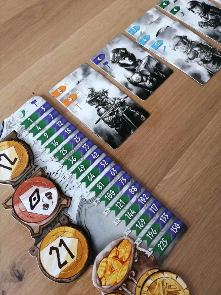Chaque joueur dispose de 5 pièces de monnaie de valeurs différentes au début de la partie. Des cartes nains (de 5 couleurs différentes et ayant des attributs différents) sont révélées dans 3 tavernes. Simultannément, les joueurs vont positionner leurs pièces de monnaie aux emplacements des 3 tavernes de leur plateau personnel. Les pièces servent de valeurs d’enchères afin de récupérer les cartes. Le joueur ayant miser la plus grosse pièce pour chaque taverne choisi sa carte en premier. Jusque là, du classique. Mais une pièce de valeur 0 permet au joueur qui l’a joué dans l’une de ses tavernes de faire évoluer une de ces pièces d’enchère non jouées en une pièce plus puissante. Et ce n’est pas tout, lorsqu’un joueur obtient un grade (présent sur les cartes) de chaque couleur, il peut recruter un Héro ! Le score final est obtenu après deux ères de quatre manches, en additionnant les points des différentes « familles » de nains et des capacités des héros.