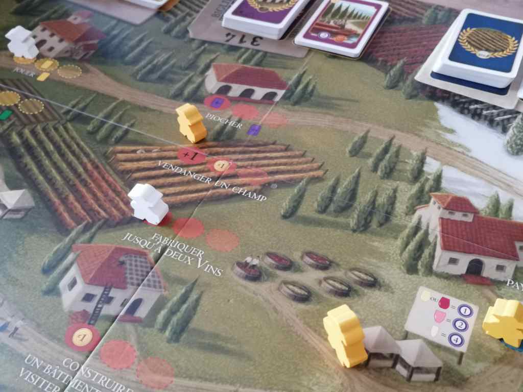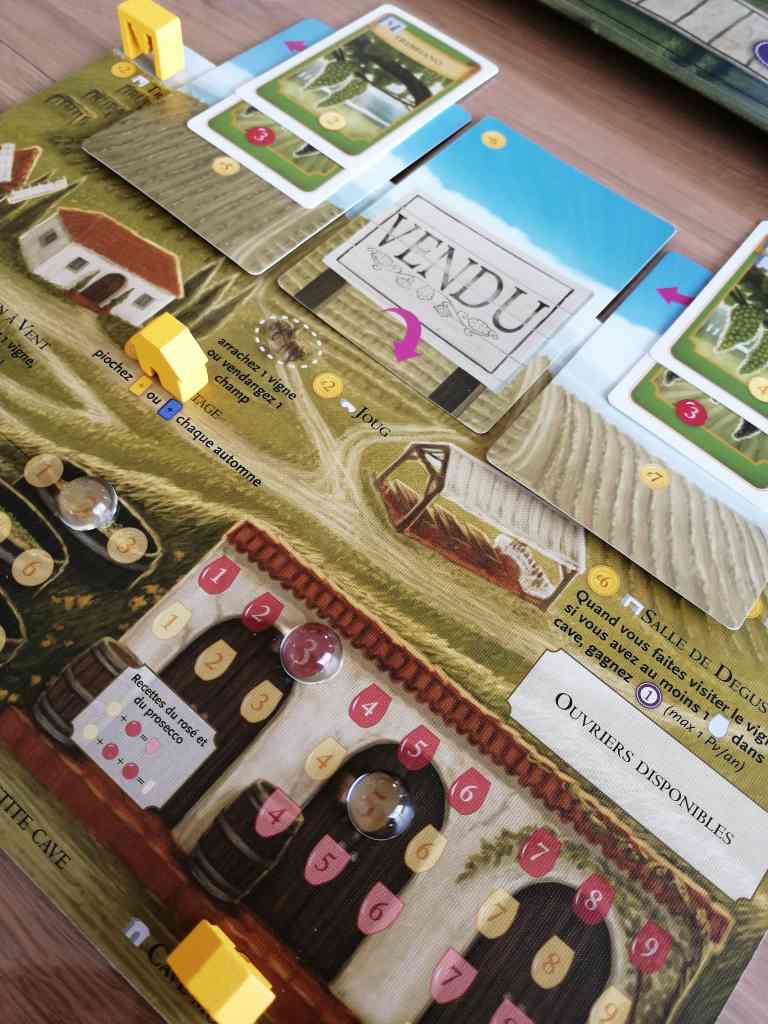 Une manche (année) est composée de quatre saisons. Chaque saison propose des actions spécifiques. Placez vos ouvriers lors de chaque saison indépendamment de manière à pouvoir effectuer les actions qui vous intéressent. L’ordre du réveil de vos ouvriers est primordial car les emplacements sont limités, certains permettent d’obtenir un bonus et l’ordre du tour sera le même lors des quatre saisons d’une année. Les choix sont nombreux… Vous pourrez construire des bâtiments, recruter un nouvel ouvrier, effectuer des échanges de « ressources », faire visiter votre vignoble, piochez ou jouez des cartes indispensables au développement de votre activité viticole, planter des vignes, les vendanger…. et j’en passe… mais surtout fabriquer du vin. Car c’est bel et bien le vin que vous allez échanger contre des points de victoire et un revenu fixe à chaque fin d’année. Le premier joueur ayant atteint 25 points de victoire déclenche la fin de partie.