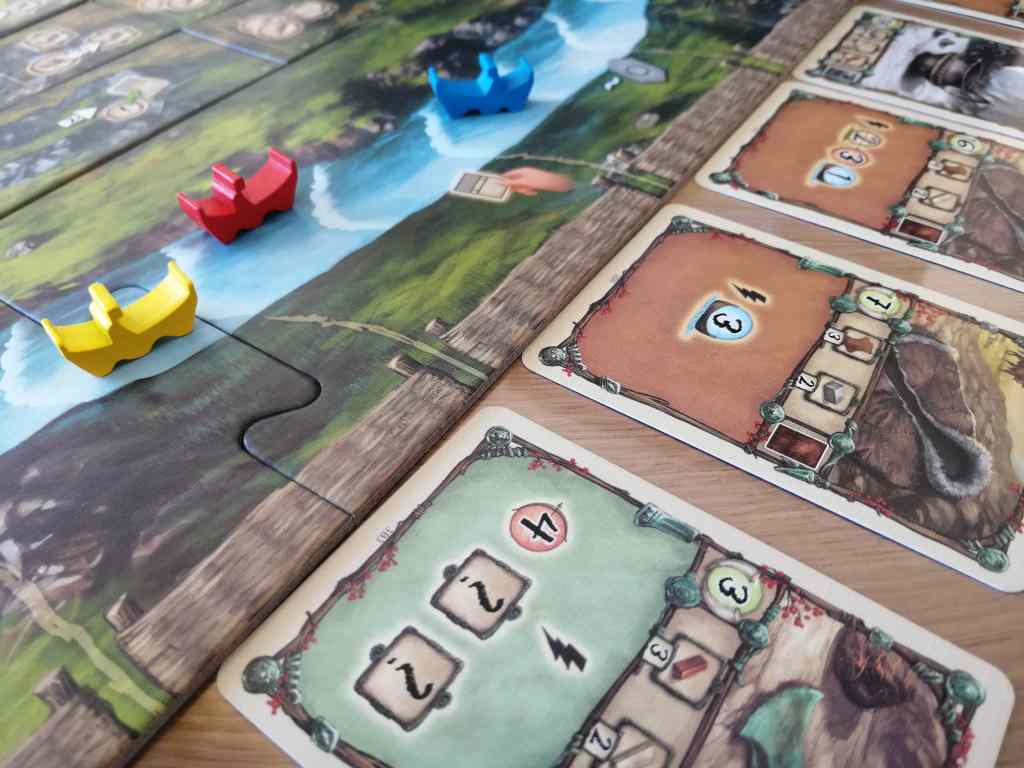 Chacun leur tour, les joueurs posent un explorateur sur une des cases de l’ensemble des cases actions du plateau. Si un explorateur adverse se trouve déjà sur la case convoitée, le joueur doit être supérieur militairement pour pouvoir occuper la deuxième place possible et perd automatiquement un point de force militaire. Le Chef de Clan, lui, peut ignorer cette condition mais ne peut être placé que sur les actions de la manche en cours ou déjà terminées. Les actions sont nombreuses et visent en premier lieu à récupérer des ressources brutes afin de les transformer en ressources raffinées, seules à pouvoir être utiliser pour fabriquer des objets indispensables à votre victoire. A la fin de chaque manche, les joueurs ne récupèrent uniquement que les explorateurs positionnés sur des actions de la manche venant de se terminer ou de celles déjà effectuée. Deux caravanes permettent d’avancer le long des routes afin de ramener divers bonus mais aussi de valider certains décomptes de points en fin de partie. Le canoé permet à chaque joueur, en le faisant naviguer plus vite, d’accroitre ses possibilités de fabrication d’outils. Le décompte de fin de partie est un savant mélange entre les objets fabriqués, le niveau militaire, la course des caravanes et les comptoirs visités.