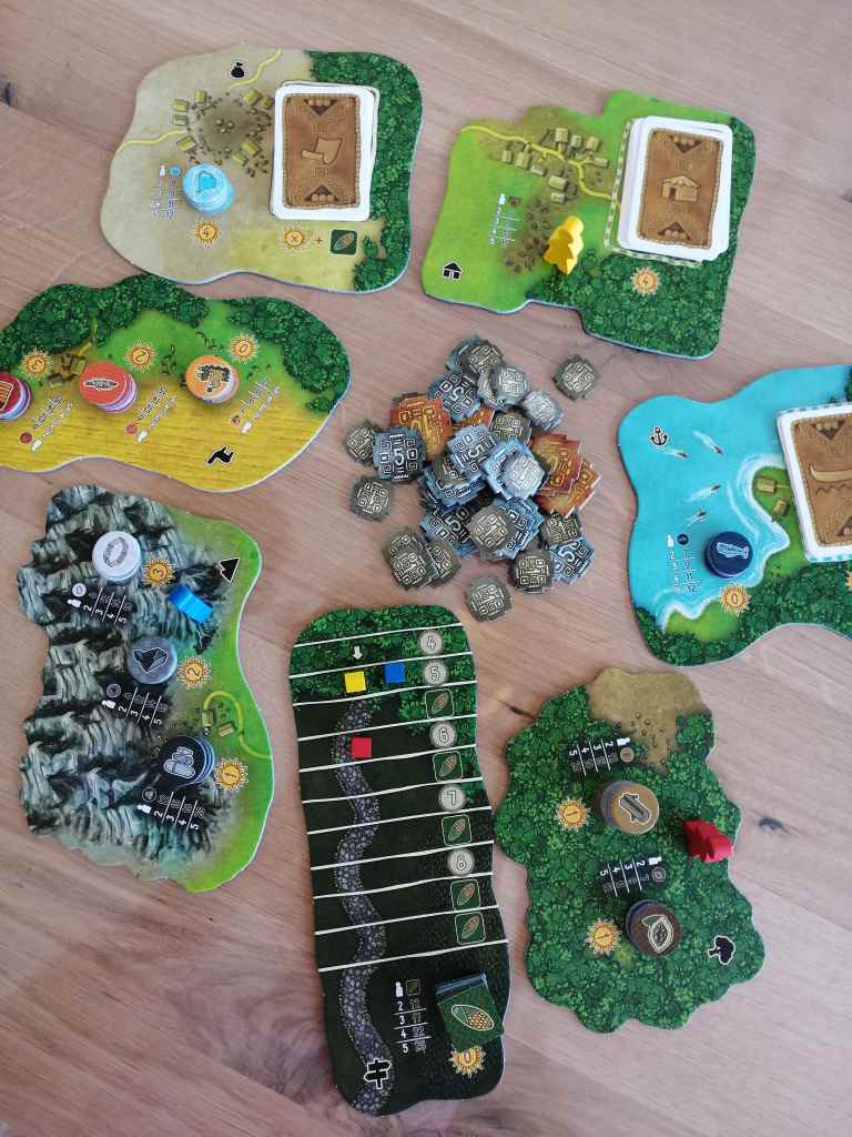 Simultanément, les joueurs vont piocher dans leurs sacs des ressources afin de les placer sur des zones d’actions de leur plateau personnel. En effet, chaque action requiert le placement de ressources spécialisées pour être réalisée. Puis chacun son tour, chaque joueur va exécuter les actions programmées dans la mesure du possible car celles ci devront être accomplies dans un lieu particulier sur les plateaux au centre de la table. Le pion voyageur de chaque joueur se déplace ainsi selon sa capacité de mouvement de plateaux en plateaux afin de réaliser les actions. La plupart du temps, elles permettent de récupérer d’autres ressources, augmenter sa capacité de déplacement, faire des échanges commerciaux, obtenir des cartes bonus et objectifs ou déposer des ressources à l’entrepôt. Attention, chaque ressource récupérée ou utilisée est placée dans un conteneur et pas immédiatement dans le sac. C’est uniquement quand le sac sera vide que toutes les ressources du conteneur seront jetées dans le sac de pioche ! Il s’agira donc pour les joueurs de se constituer « une pioche de jetons ressources » leur permettant d’augmenter les probabilités de pouvoir faire les actions souhaitées dans les tours futurs. Le joueur ayant engrangé le plus de points de victoire est déclaré vainqueur, points de victoires récupérés par les jetons ressources acquis et stockés ou dans les objectifs réalisés.