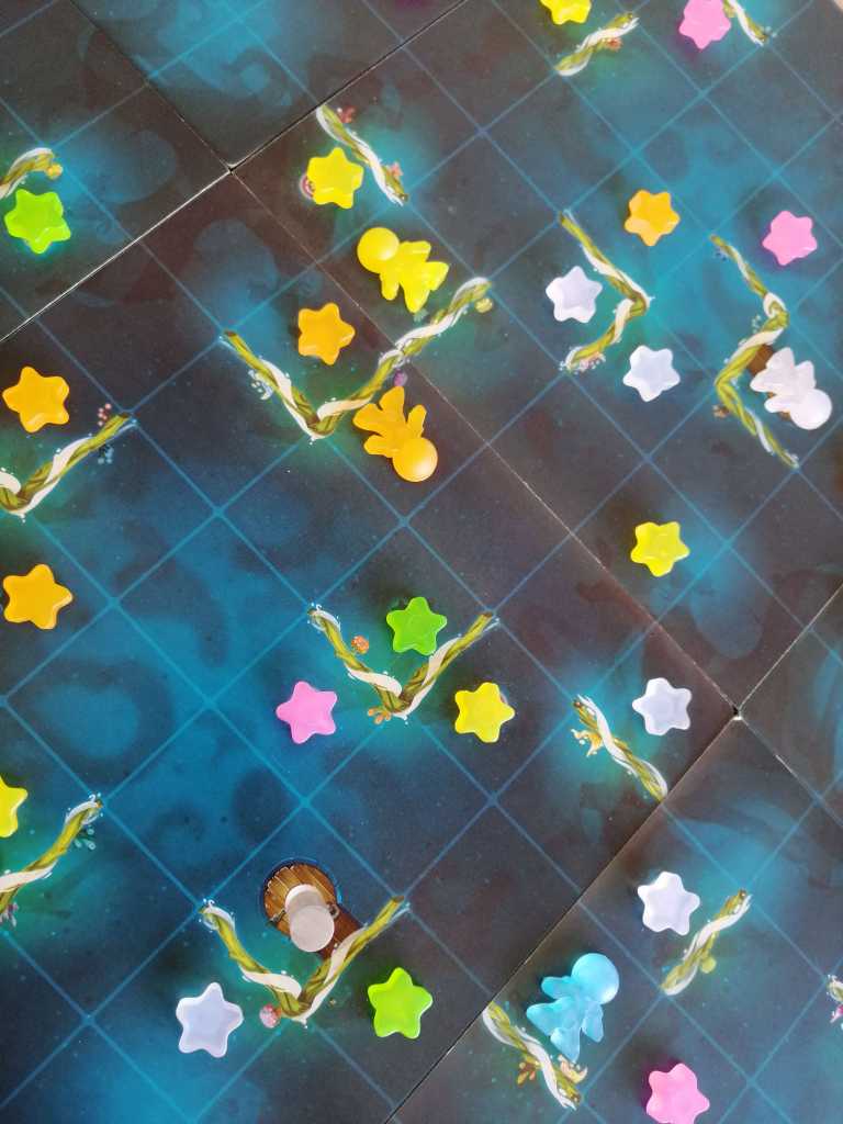 A votre tour, jouez une de vos 5 cartes en main possibles afin de déplacer ou orienter votre aventurier. A la fin de la partie, les étoiles récoltées vont se transformer en points de victoire. Mais cela serait excessivement simple si la gravité n’était pas au centre du jeu et de tous vos déplacements ! En effet votre aventurier, après chaque action, tombera jusqu’à atteindre une plateforme.