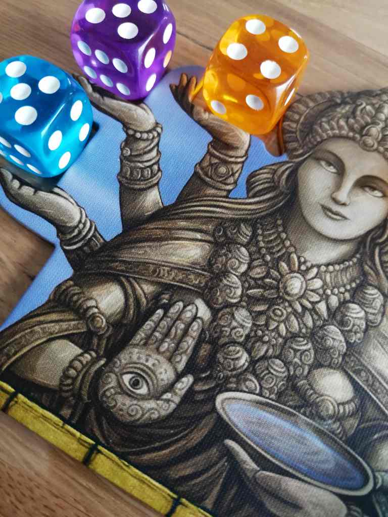 Chacun leur tour, les joueurs placent un ouvrier sur une des nombreuses cases actions du plateau de jeu. L’action effectuée est le plus souvent payée en défaussant un ou plusieurs dés de couleurs et de valeurs déterminées par l’action elle même et par le joueur. Il est possible de récupérer des dés, vendre des marchandises contre de l’argent, effectuer les actions du Palais, faire progresser son bateau sur le Gange mais surtout agrandir son territoire. En effet, chaque joueur possède un plateau personnel représentant sa Province. C’est en le complétant que les joueurs progressent sur les pistes de Prestige et d’Argent… Ce qui nous amène au but du jeu : être le premier à faire croiser ces deux marqueurs sur ces deux pistes.