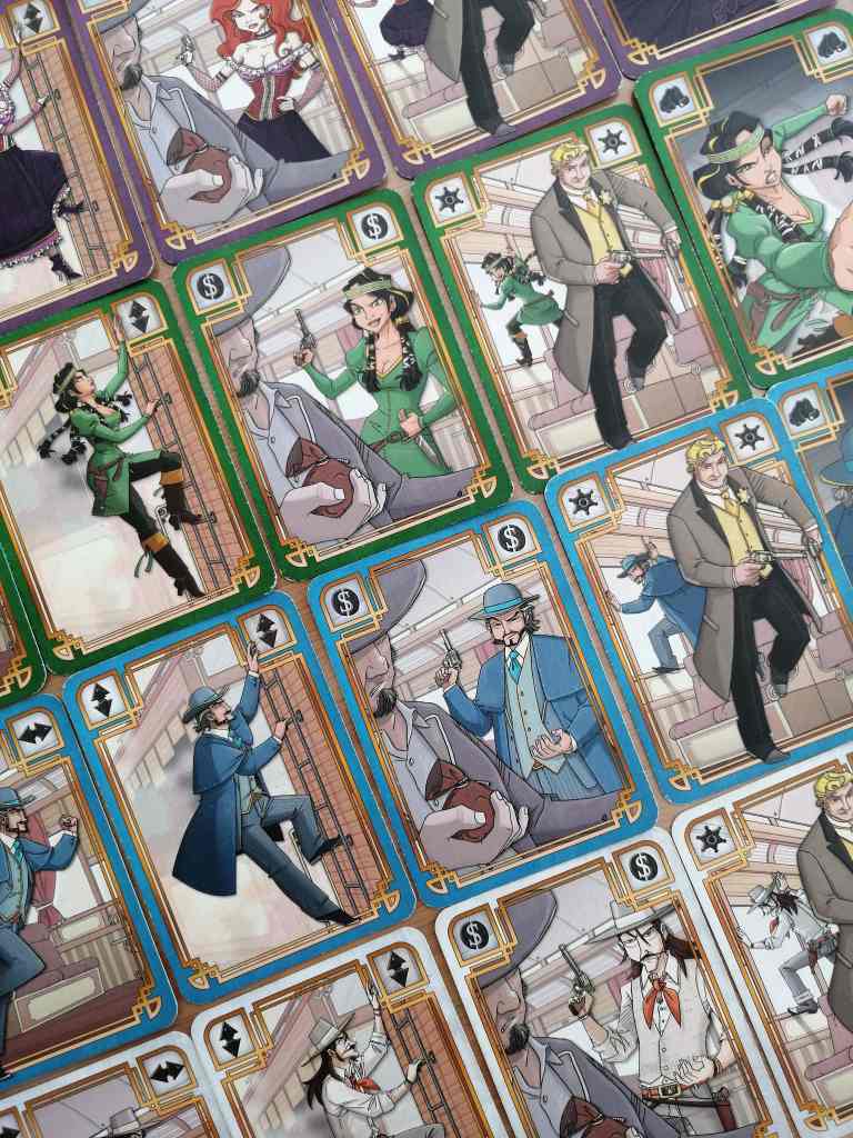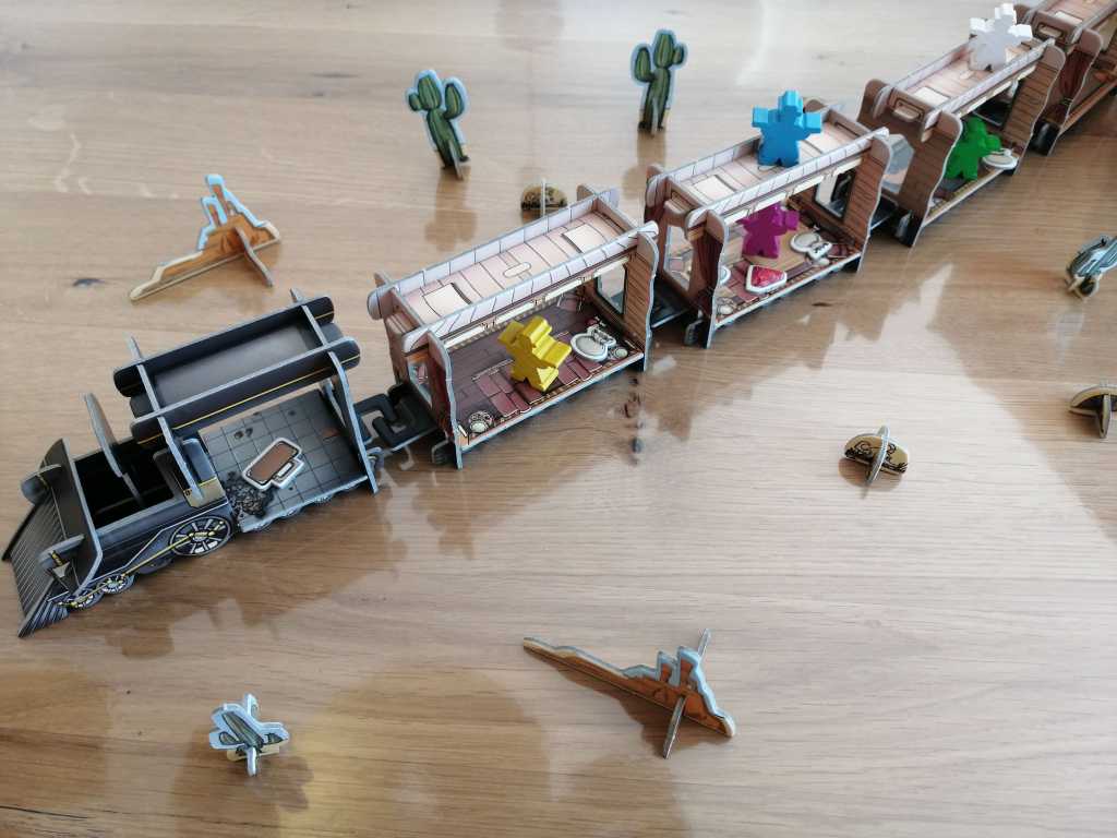 Chaque joueur débute la partie dans la peau d’un personnage aux caractéristiques singulières. Cependant, tous les joueurs possèdent une main de cartes identiques, qu’ils vont mélanger pour en piocher six. La phase de programmation peut alors commencer. En suivant les indications de la carte manche, les joueurs vont jouer à tour de rôle une de leur carte face visible ou cachée sur une pile commune jusqu’à en avoir jouer 4, 5 ou 6 selon le plan de la manche. Puis, l’ensemble des actions sont résolues. Le paquet de carte commun est retourné, et les actions sont effectuées par les joueurs concernés en suivant obligatoirement les indications des cartes jouées. Le personnage incarné va donc pouvoir se déplacer, monter (ou descendre sur le toit), tirer sur un autre voyageur, donner un coup de point, faire bouger le Marshal ou récupérer un butin. Évidemment tous les plans ne se passeront pas comme prévu et chaque action a des conséquences sur le cours du jeu. A la fin des 5 manches de jeu, le joueur ayant récupérer le plus gros butin est déclaré vainqueur !