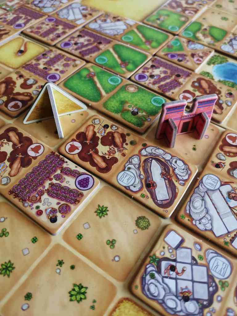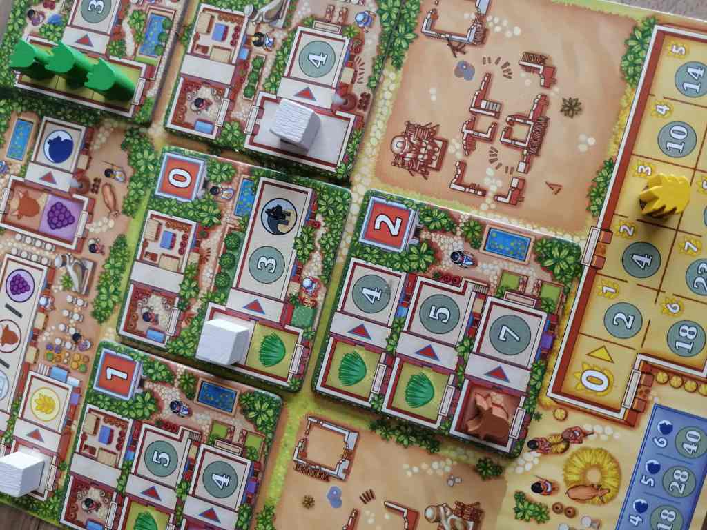 Le tour d’un joueur se compose de trois étapes. En premier lieu, le joueur choisit un domino parmi les trois de sa réserve personnelle. Il le place sur le plateau de jeu de manière à faire coïncider au moins une moitié de son domino avec un déjà posé. Le type de terrain doit être identique. Il récupère ainsi les ressources du domino posé en connexion avec les mêmes types de terrains adjacents. Ensuite, le joueur a la possibilité d’acheter un quartier et de l’ajouter à son plateau personnel. Enfin, le joueur peut alimenter en ressources les boutiques de ses quartiers de son plateau. Toute ressource non utilisée est perdue d’un tour à l’autre. Les boutiques, une fois alimentées, fournissent des points de victoire, du blé ou encore des représentations de Dieux. Le décompte final prend en compte évidemment les points de victoire des boutiques alimentées, le niveau en « blé » des joueurs, la collection des représentations de Dieux mais aussi la majorité des édifices construits sur le plateau sur une case vide et isolée.