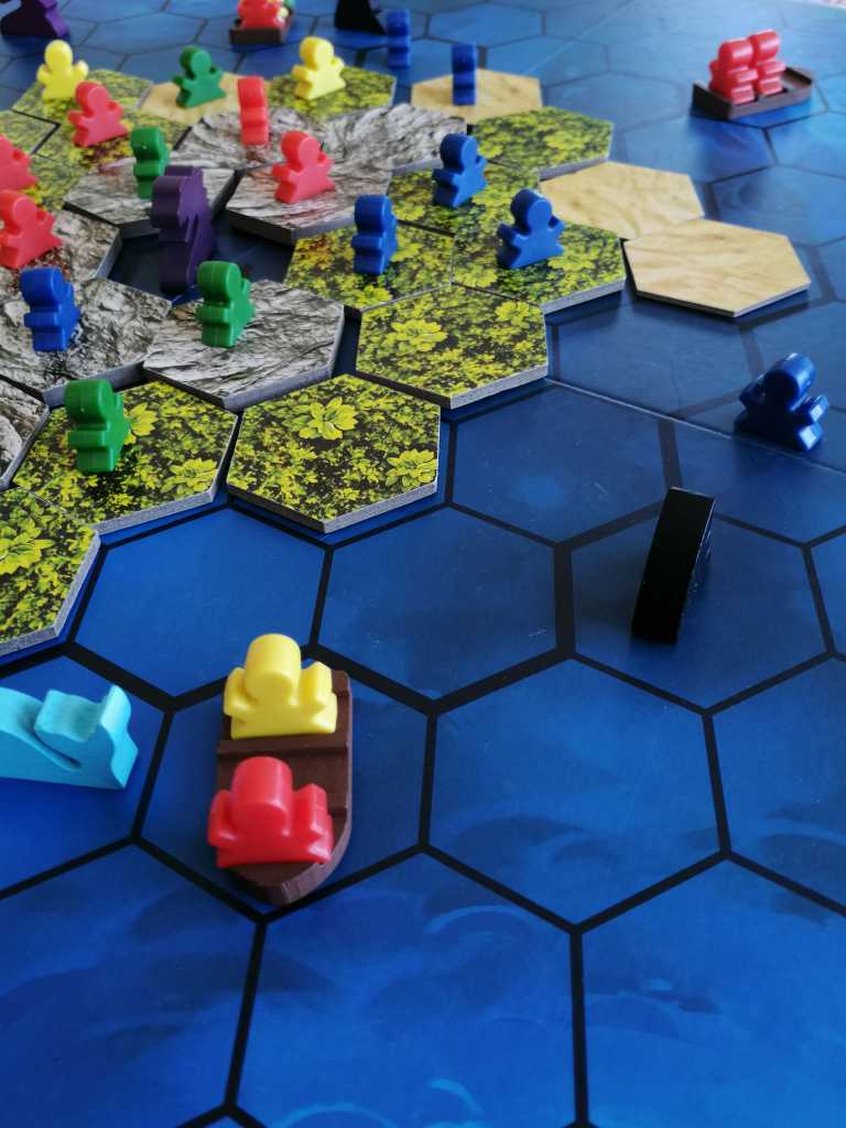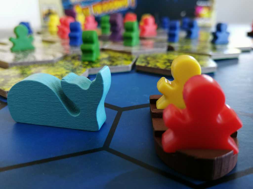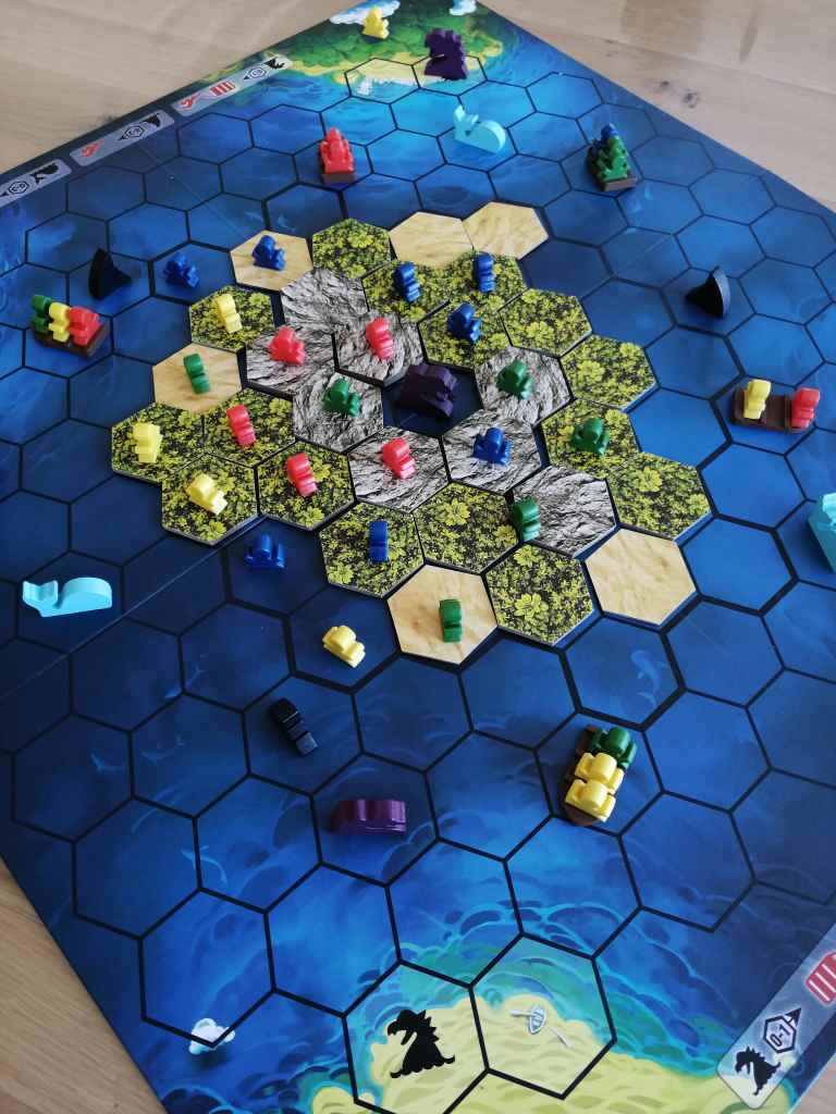 Après le placement de tous les explorateurs sur l’île centrale par les différents joueurs, la partie peut commencer. Le tour d’un joueur se compose de quatre phases. Dans un premier temps, il peut jouer une tuile « terrain » acquise auparavant, puis déplacer ses naufragés à raison de 3 mouvements, retirer une tuile terrain du plateau et enfin lancer le dé événement, mettant en jeu les créatures marines. Il s’agira de faire rejoindre la terre ferme aux différentes explorateurs de notre clan entre requins, baleines et serpents de mer, et en utilisant aux meilleurs moments l’aide précieuse des tuiles « terrains ». Chaque explorateur rapporte un nombre de points de victoire différent une fois arrivé sur la rive. Les joueurs en prendront connaissance au début de la partie et devront essayer de s’en rappeler. Évidemment, la vitesse de déplacement ne sera pas la même si votre explorateur se trouve bien au chaud dans un bateau ou dans l’eau, tout comme les conséquences des attaques des créatures marines. Attention à elles mais surtout aux autres joueurs, qui seront prêts à tout pour s’offrir une place au soleil ! Une fois la tuile volcan dévoilée, la partie s’achève et les joueurs comptent les points de victoire de leurs explorateurs arrivés sur les 4 rives.
