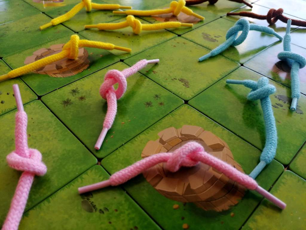 Simultannément, les joueurs vont essayer de prendre possession de trois des quatre tours présentes sur le plateau en positionnant leurs vers de terre sur ces cases. Pour cela, les joueurs vont faire des nœuds avec les lacets représentant leurs lombrics et les faire se multiplier de cases en cases adjacentes. Il sera également possible de défaire les nœuds adverses pour prendre position.