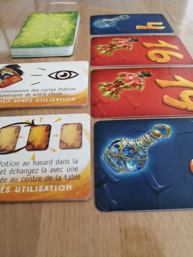 Au centre de la table, et selon le nombre de joueurs, des cartes potions sont posées faces visibles ou cachées accompagnées de deux cartes actions. Les cartes potions portent des numéros de 1 à 19.