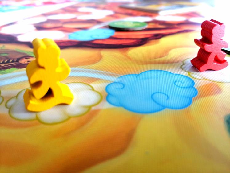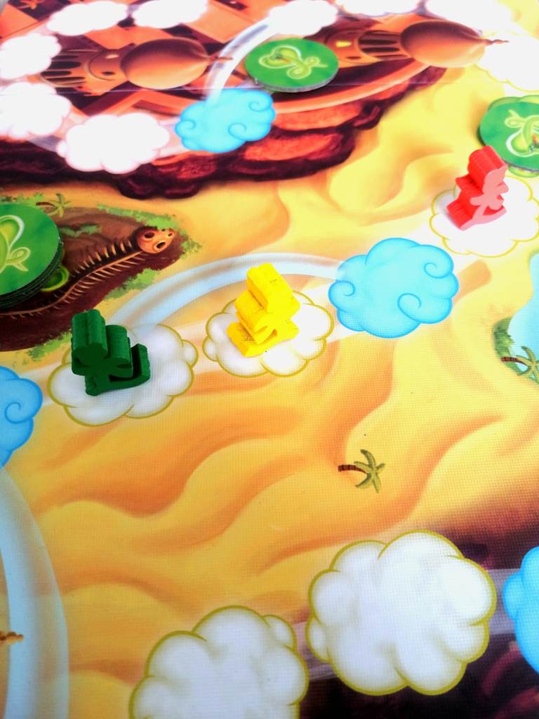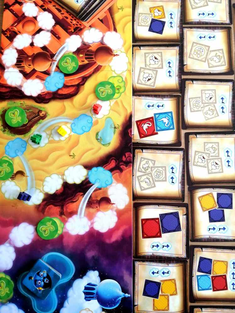 Simultannément, et à chaque manche, les joueurs doivent reproduire strictement les symboles de l’une des quatre cartes retournées en pliant leur tapis. Ainsi seuls les symboles d’une carte doivent apparaitre face visible sur le tapis de chaque joueur. Dès qu’un joueur parvient à reproduire une carte, il s’en saisit ainsi que le jeton d’initiative associé, et déclenche le sablier de 30 secondes mettant la pression aux adversaires pour tenter de reproduire une autre carte. A la fin de chaque manche, les joueurs avancent sur le plateau principal du nombre de nuages cumulés sur le jeton initiative et la carte réussie. Des raccourcis et handicaps viennent pimenter la course. Le premier joueur à atteindre le Palais est déclaré vainqueur.