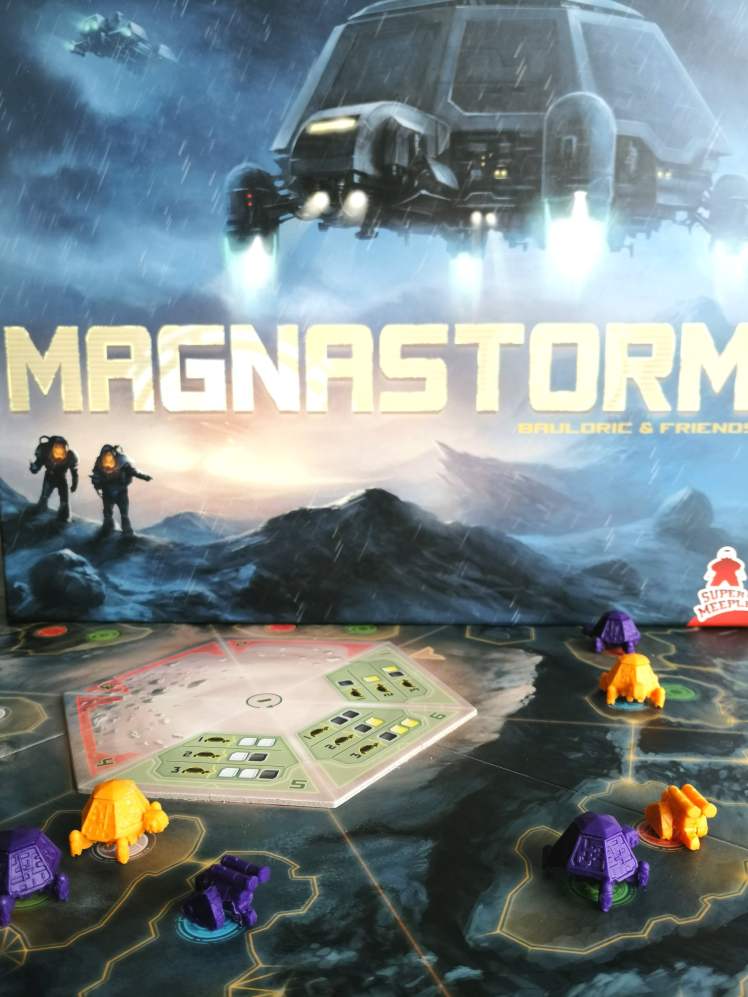 MAGNASTORM est resté longtemps sur l’étagère avant que je lance ma première partie. Pourtant la mécanique me parlait et annonçait de bons moments ludiques, mais c’est sa règle de jeu peu attrayante et son style graphique austère qui ne favorisaient pas mon passage à l’acte. Passés ces deux éléments extérieurs, finalement, mes préjugés positifs se sont avérés justes. MAGNASTORM propose une course aux points intéressante et tendue sous forme de pose d’ouvriers assez originale. Les choix sont orientés par les objectifs de la partie, et par les zones de déplacement et d’installation des Laboratoires Tortues. Les options stratégiques peuvent paraître en ce sens un peu restreintes mais ont le mérite d’être extrêmement claires et rendent le jeu bien plus accessible que ce que je pensais. L’originalité de MAGNASTORM tient dans l’utilisation des « ouvriers » neutres par tous les joueurs pour la réalisation des actions et dans les ressources « spécifiques » d’un joueur par rapport à un autre. Tous ces éléments donne un jeu fluide et complet dans lequel les interactions se concentrent subtilement à la fois dans le positionnement sur le plateau mais aussi par le contrôle des commandants. Sans être un véritable coup de cœur pour moi, MAGNASTORM est un très bon jeu de gestion, orchestrant des poses d’ouvriers accessibles, atypiques et tactiques, une course aux points et aux objectifs et de la majorité territoriale.