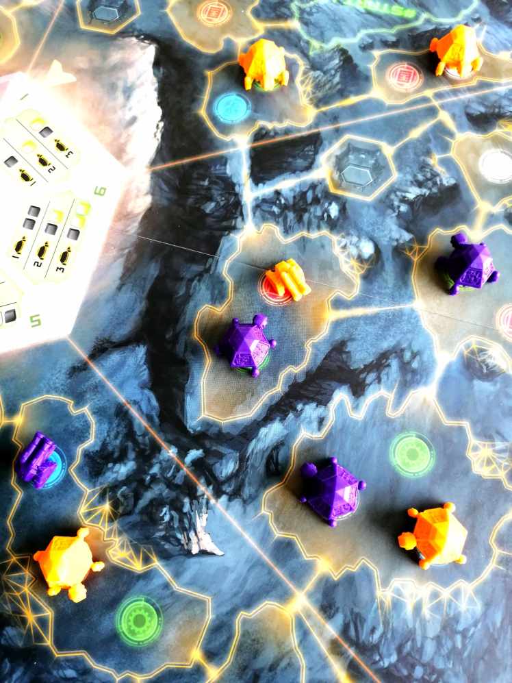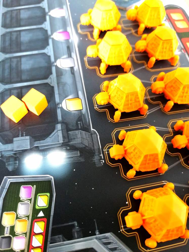 – Choisir un membre d’équipage neutre ou de leur couleur sur le plateau d’actions supérieur pour le positionner sur le plateau d’actions inférieur. Ce positionnement peut leur faire obtenir un bonus en plus de l’action à réaliser. Les joueur ont alors deux choix d’actions : il peuvent recevoir des ressources ou déplacer leur « Scoot Runner » sur le plateau principal. S’ils choisissent la deuxième option, ils pourront à la suite de leur déplacement placer un « Laboratoire Tortue » sur un site de construction et éventuellement une « Station de Téléportation ». Attention, les « Scoot Runner » ne peuvent pas se rendre dans une zone de tempête, construire un Laboratoire permet d’évoluer sur les pistes scientifiques et construire une Station de téléportation octroie des points de victoire.