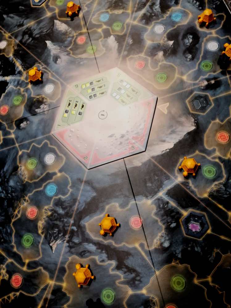 A la fin de chaque manche, les joueurs reçoivent des ressources selon le nombre de Laboratoires construits dans les « zones calmes » et des points de victoire en fonction des majorités. Le joueur le plus haut sur chaque piste scientifique prend le contrôle du Commandant Scientifique correspondant et de son pouvoir. La tuile centrale « Tempête » pivote d’un cran.