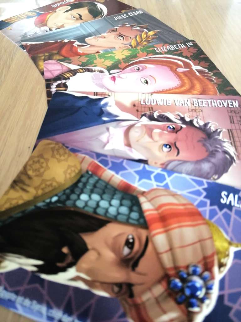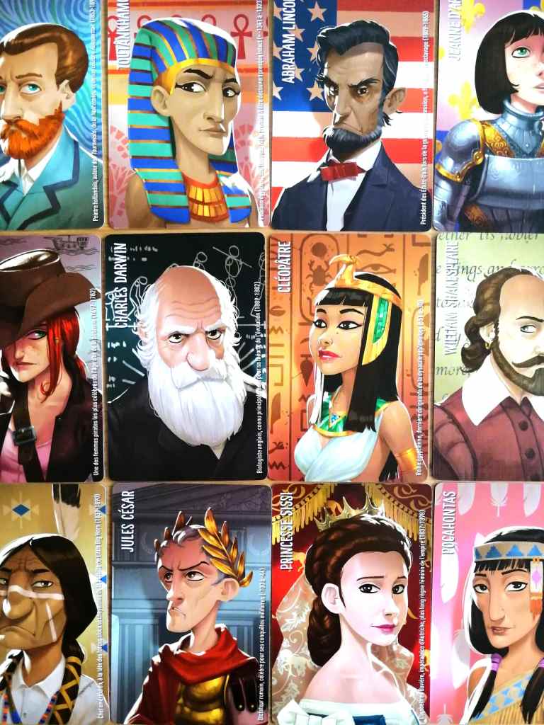 Le narrateur prend connaissance secrètement d’une carte « personnage historique » et la mélange à 11 autres cartes pour ensuite les disposer au centre de la table. Les autres joueurs vont devoir déduire quel est le personnage secret en éliminant des cartes au fur et à mesure de la partie. A chaque manche, le narrateur choisit une de ses 5 cartes en mains et la dispose à côté des autres cartes. Cette carte représente un indice. Si elle est posée verticalement, le personnage à identifier possède un point commun avec celui de l’indice, si elle est posée horizontalement, alors il y a au moins une « chose » qui les différencie. Cela peut être tout et n’importe quoi… Le sexe, la couleur des yeux, les motifs du fond de la carte, la période historique, la nationalité… Le narrateur n’a évidemment pas le droit de communiquer. Les joueurs éliminent un personnage à la manche 1, deux à la manche 2, trois à la manche 3 et quatre à la manche 4. Ils ont le choix entre deux pour la manche finale. Les indices sont valables toute la partie. Si les joueurs arrivent à identifier le « bon » personnage à la fin des 5 manches, alors ils gagnent ensemble.