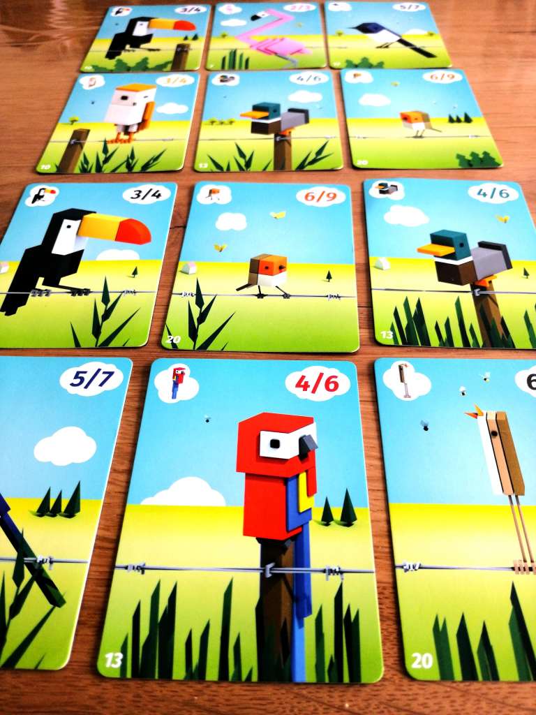 Trois cartes oiseaux sont positionnées en 4 rangées au centre de la table. Chaque joueur possède une main de 8 cartes oiseaux. Chacun leur tour, les joueurs vont déposer d’un côté ou de l’autre d’une rangée toutes les cartes oiseaux d’une espèce qu’ils possèdent. Ainsi, ils récupèrent les cartes entre la première carte déposée et l’oiseau de même espèce se trouvant déjà dans la rangée initiale. Ensuite, de manière optionnelle, les joueurs peuvent faire des envolées. Il s’agit de défausser un nombre de cartes de la même espèce pour en conserver une ou deux devant soi. Attention, dès qu’un joueur n’a plus de cartes en main, la manche prend fin et tous les autres joueurs sont dans l’obligation de défausser toutes leurs cartes en main ! Le vainqueur sera le premier joueur à obtenir devant lui un oiseau des 7 espèces différentes existantes ou au moins 3 oiseaux de deux espèces différentes.
