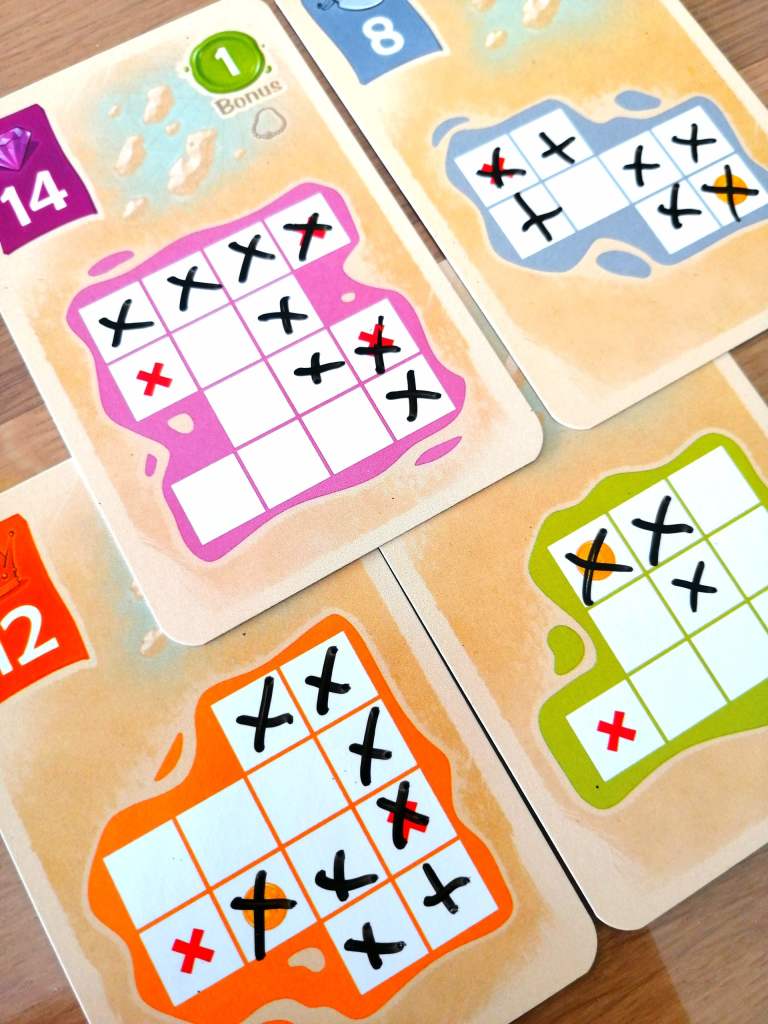 Pendant quatre manches, les joueurs vont devoir « cocher » quelque part sur leur cartes « îles » les cases correspondantes aux « polyominos » figurants sur les 7 cartes « pistes » dévoilées les unes après les autres dans chacune des manches. Dès qu’une carte « île » est entièrement complétée, le joueur choisit une autre « île » parmi celles exposées au centre de la table ou la première de la pile face cachée. En cochant les cases or, palmiers ou « croix », les joueurs obtiennent des bonus divers. En fin de partie, le joueur ayant le plus de points de victoire en additionnant la valeur des cartes « îles » terminées et de leurs possibles « bonus sceau », les pièces d’or récupérées et leurs bonus associés et les points des palmiers l’emporte.