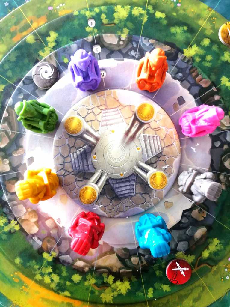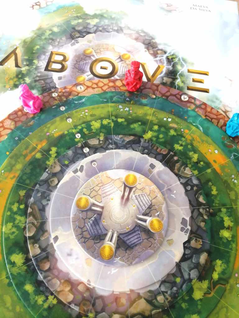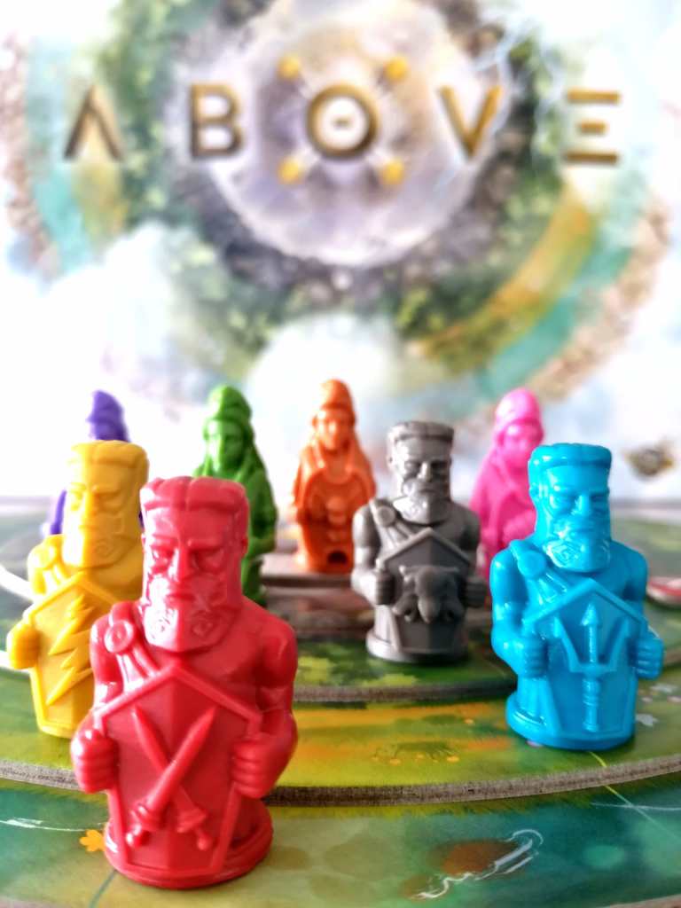 ABOVE a été le premier jeu aperçu lors de mon passage au FIJ 2020 de Cannes. Je me souviens très bien de ce plateau « géant » clairement différent de ce que l’on a l’habitude de voir, attirant immédiatement les regards par sa singularité et son style épuré et élégant. L’esthétisme général correspond fidèlement à la mécanique proposée, simple mais raffinée. Sous prétexte d’une thématique plutôt très bien concrétisée, ABOVE prend la forme d’un véritable jeu d’échecs dans lequel le hasard n’existe pas. Son originalité tient dans le fait que les deux joueurs jouent tous les Dieux et peuvent gagner avec n’importe lequel d’entre eux. Les options tactiques et stratégiques sont nombreuses, et doivent en permanence être anticipées et calculées par rapport aux potentielles actions de son adversaire. En ce sens, ABOVE demande de la concentration pour profiter au maximum des possibilités qui nous sont offertes, sans en laisser à notre adversaire. Le duel est donc très tendu, d’autant plus que les parties se veulent plutôt rapides. Très peu de jeux abstraits arrivent à me convaincre, ABOVE est parvenu à me faire passer de bons moments même si je n’en ai pas encore exploité toutes les subtilités. Je trouve effectivement les débuts de parties un peu poussives, sans savoir trop les stratégies à adopter, ni l’importance de faire avancer un Dieux plutôt qu’un autre. Ces choix s’affinent au fur et à mesure de la partie et deviennent de plus en plus évidents et primordiaux. Les vrais joueurs d’échecs verront je pense immédiatement et spontanément ce qui m’échappe ou ce qui me dépasse. Au delà de mes goûts personnels, peu tournés vers les jeux abstraits, ABOVE est un excellent jeu, très tactique, bien fichu et intelligemment mis en scène. Sa fluidité et son apparente simplicité sont deux atouts majeurs qui lui permettent de faire partie désormais du cercle assez fermé des « jeux à deux » qui comptent, sans parler de sa version par équipe très agréable et maligne.