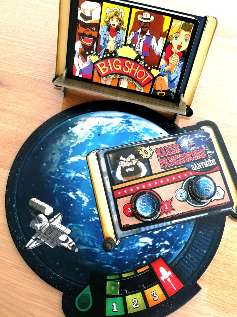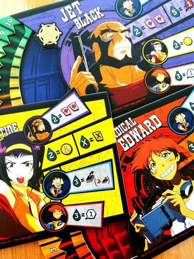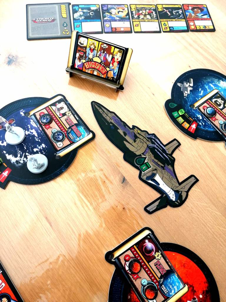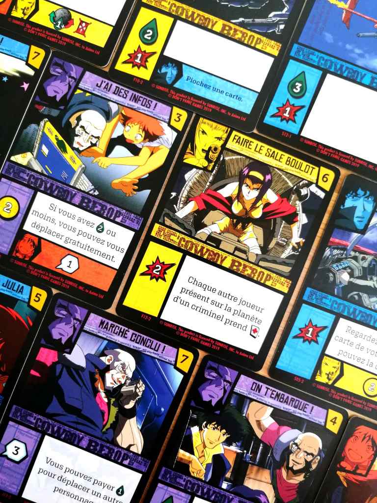 Honte à moi ! Je ne connais absolument pas la série d’animations japonaise des années 90 dont le jeu se veut le porte parole… Après m’être un peu renseignée et surtout après avoir expérimentée cette thématique lors de plusieurs parties, je le regrette un peu. J’ai l’impression d’être passée à côté d’un dessin animé plutôt cool, déjanté et original. C’est ce que m’a fait réaliser immédiatement la lecture des règles de COWBOY BEBOP le jeu, en plus de ses illustrations « mangas » superbes, donnant une pêche d’enfer. COWBOY BEBOP présente donc un jeu de Deck-Building parfaitement thématisé et assez immersif même pour les incultes dont je fais partie. La mécanique est traditionnelle. Il s’agira de se constituer une main de carte la plus efficace possible pour réaliser des actions de plus en plus puissantes. L’originalité viendra surtout du côté semi-coopératif à éliminer les criminels de l’espace et dans l’utilisation des pouvoirs de nos adversaires. Ces deux facteurs rendent COWBOY BEBOP plus interactifs que d’autres jeux de ce style. Le jeu se veut fluide et dynamique et les combinaisons des cartes entre elles sont en réalité bien plus simples que la règle ne le laisse penser. Un jeu efficace, qui rempli parfaitement sa mission et qui plaira sans aucun doute aux amateurs de Deck-Building. Même si les fins de parties me laissent un peu sur ma faim, en ne comprenant pas vraiment l’intérêt de la petite ou grande victoire, COWBOY BEBOP est un très bon jeu, immersif, présentant de petites singularités qui en font un tout agréable et plutôt accessible.