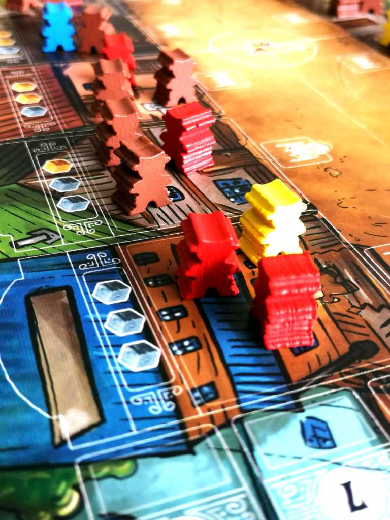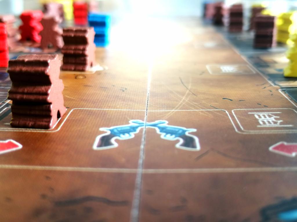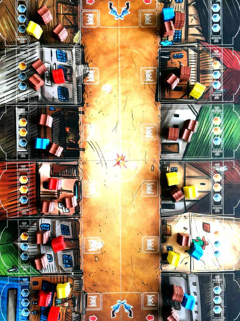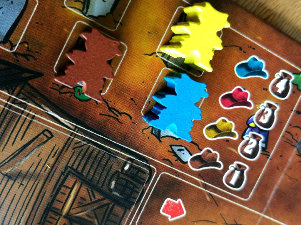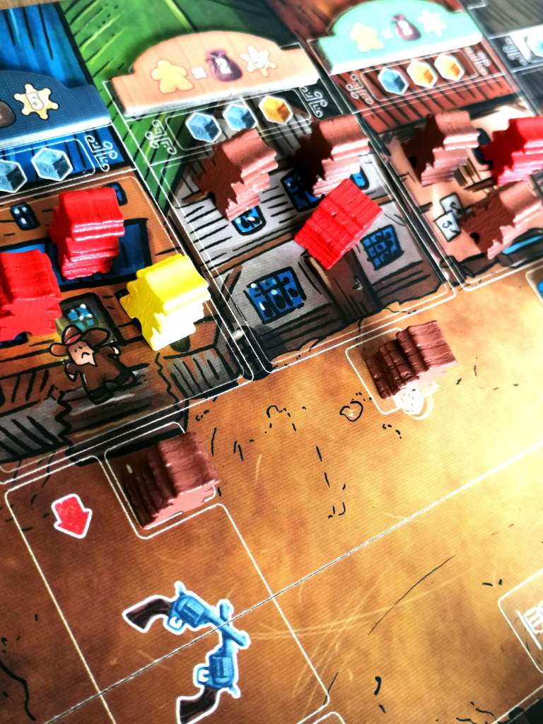 A votre tour de jeu, choisissez un bâtiment, prenez tous les meeples s’y trouvant et égrainez les à l’entrée de chaque bâtiment dans la direction que vous souhaitez. Ensuite, faites entrer vos meeples dans chaque bâtiment dans l’ordre que vous souhaitez et déclenchez les actions correspondantes à la couleur du meeple entrant. En effet, chaque meeple présente ses propres caractéristiques. Les ouvriers construisent les tuiles « chapiteau », les mineurs récupèrent des ressources, les bandits « braquent » les mineurs, les adjoints arrêtent les bandits et « Madame » aguiche les ouvriers… Toutes ses actions ont pour objectif principal de récupérer des ressources (pierre et or) afin de construire des « chapiteaux », lieux permettant de récupérer d’avantages de ressources et points de victoire en fin de parties. Les joueurs peuvent également déclencher des « duels de lancers de dés » pour éliminer certains meeples et gagner des ressources. La fin de partie est déclenchée lorsqu’il n’y a plus de « Barre d’or » à acheter par les joueurs contre des ressources « or », qu’il n’y a plus de place au Cimetière, conséquence de Duels qui ont mal tournés, ou que les caisses de dynamites ont été piochées dans le sac de ressources. Le vainqueur sera le joueur ayant réunit le plus de points de victoire entre les « chapiteaux » lui appartenant, les barres d’or achetées, et les ressources « or » lui restant.