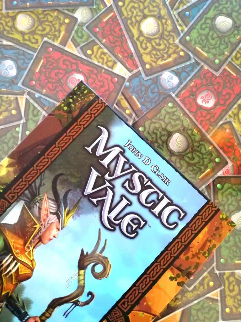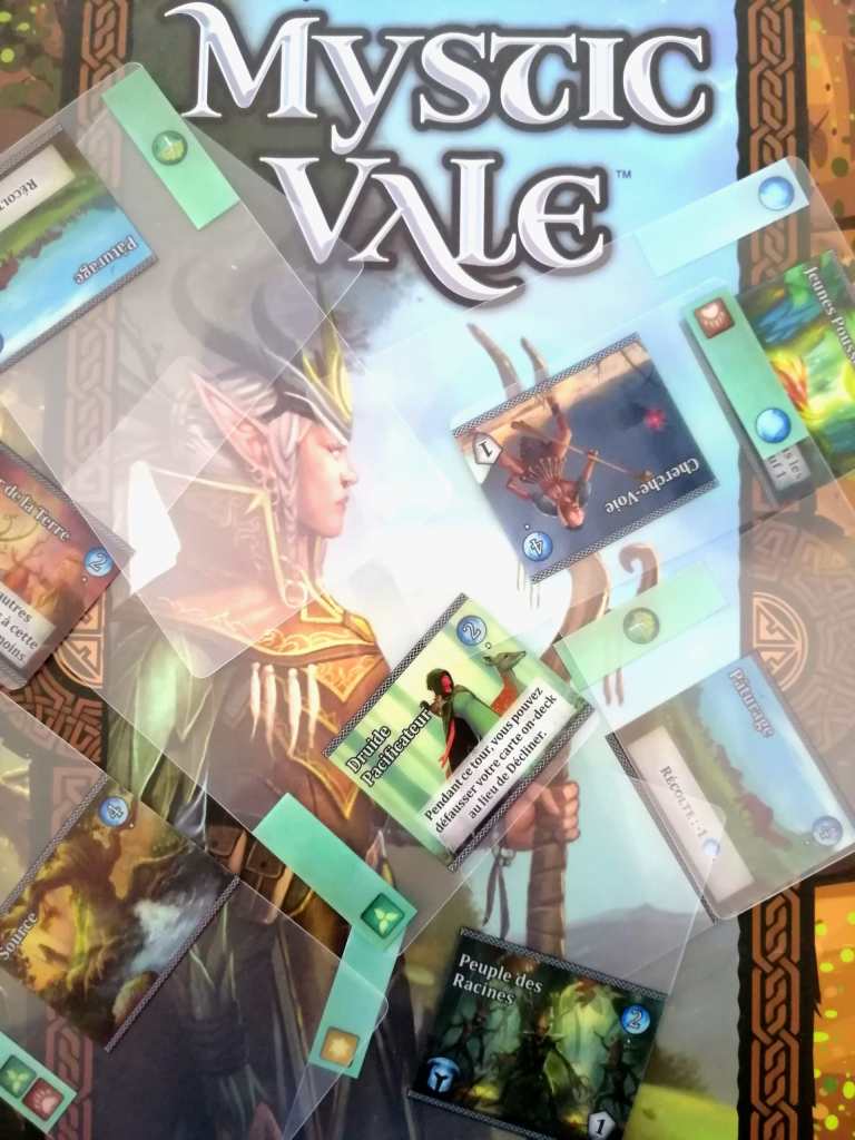 J’avais eu l’occasion de tester en mode accéléré MYSTIC VALE au festival de Cannes de cette année. En ne comprenant pas toutes les subtilités de la langue Anglaise, j’avais déjà eu un bel aperçu du potentiel de ce « Deck Building » singulier et au matériel très attrayant. Car c’est bien l’utilisation du matériel qui est au cœur de la mécanique de jeu. Le système de « Craft Carding » fonctionne parfaitement et rend MYSTIC VALE innovant alors que sa mécanique principale est rigoureusement traditionnelle… Ou presque… En effet, il n’est pas question ici de dévoiler un nombre de cartes fixe et de « faire avec ». Ce sont aux joueurs de décider à quel moment il sera necessaire d’activer les cartes « sorties » du « Deck », avec le risque de devoir passer leur prochain tour s’ils sont trop gourmands. Cette prise de risque dans ce « mini stop ou encore » distingue encore et légèrement Mystic Vale de ses concurrents, lui octroyant une souplesse agréable et le rendant un peu plus « fun » que les autres. Mais revenons au plaisir de façonner ses cartes au fur et à mesure et de constater une montée en puissance certaine. La manipulation du matériel est jouissive et la très bonne lisibilité des cartes permet des sensations de jeu fluides et agréables. L’édition est très soignée, entre un matériel de très belle qualité et de chouettes illustrations, nous rappelant une thématique très vite oubliée, comme dans la plupart des jeux de « Deck Building ». D’ailleurs, MYSTIC VALE souffre des mêmes maux que la plupart des autres jeux de ce style, à savoir une certaine répétitivité, peu d’interactions, des pouvoirs parfois plus puissants que d’autres et une rejouabilité limitée sans extension… Mais l’expérience proposée est suffisamment originale, fluide et intéressante pour que MYSTIC VALE trouve son public, d’autant plus que les règles sont facilement accessibles, et que la courbe de progression est forte au fur et à mesure des parties. Un jeu attirant de part l’utilisation de son matériel et captivant de par son efficacité mécanique. Comme quoi, le plastique est parfois (mais rarement) fantastique !