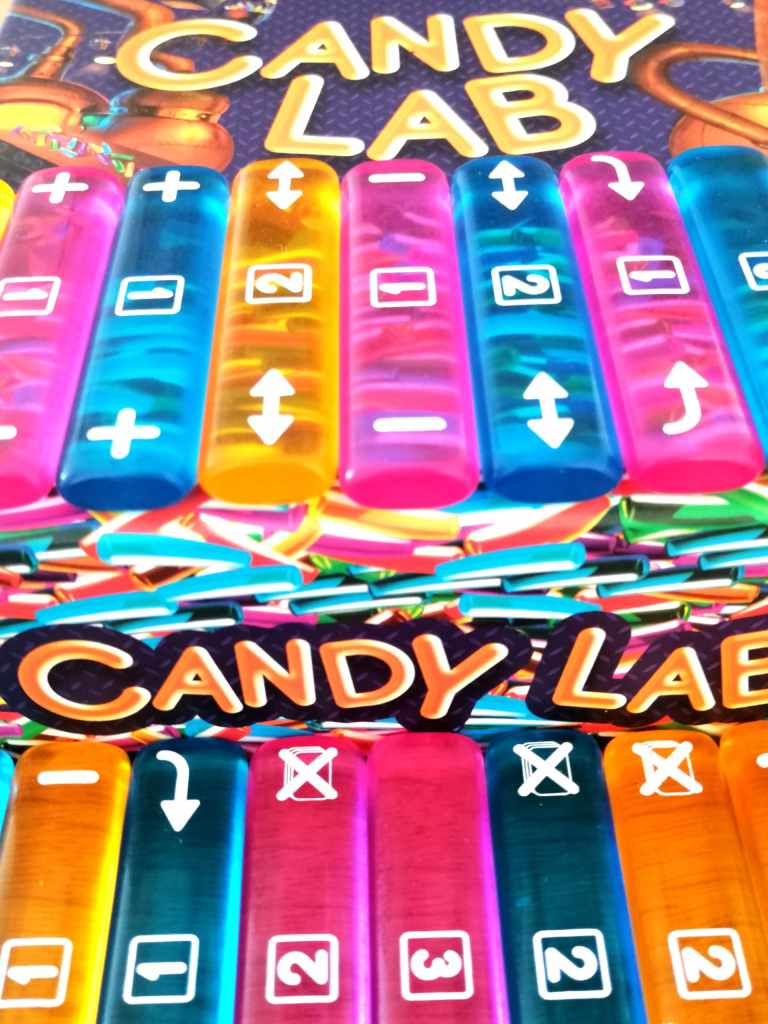 J’attendais impatiemment la sortie de CANDY LAB depuis que j’avais gouté (au sens propre comme au figuré ! ) à son côté acidulé et décalé au Festival de Cannes de cette année. Son arrivée, juste avant de partir quelques jours en vacances, tombait à la perfection. Dès la mise en place, l’impression visuelle est très agréable. Son matériel coloré, collant parfaitement au thème original proposé, tient immédiatement les joueurs en haleine. L’envie est là, irrémédiablement ! On ne peut pas s’empêcher de penser à l’épreuve des bâtonnets de « Fort Boyard » à la vue de l’alignement des Sucre d’Orge au centre de la table. Et c’est bien là, la seule ressemblance… Car CANDY LAB ne s’arrête pas à prendre des bâtonnets au « pifomètre ». Il faut les choisir précieusement, selon les commandes que l’on doit réaliser mais surtout selon les pouvoirs qu’ils octroient. L’essence du jeu se situe dans les interactions fortes que suggèrent les pouvoirs des Sucres d’Orge… Et en ce sens, les coups bas sont nombreux, tant jubilatoires pour les uns que frustrants pour les autres. Il faut avoir un certain sens de l’humour et ne pas être trop rancunier pour apprécier pleinement la « douceur explosive » de CANDY LAB. Les prévisions d’actions tombent souvent à l’eau tant le jeu bouge vite et peut se renverser totalement en quelques secondes. C’est d’ailleurs ce qui fait le charme controversé de CANDY LAB… Tout peut arriver et les joueurs, même très mal engagés, peuvent se « refaire la cerise » en un ou deux tours. Il ne faut absolument pas chercher le contrôle absolu tant le hasard de la pioche est présent, les alliances contre un joueur peuvent être redoutables et les pouvoirs des bâtonnets sont parfois rudes à encaisser. Il faut vouloir et pouvoir se laisser porter par la légèreté des évènements, nombreux, parfois injustes ou malchanceux. Mais c’est aussi dans ce manque de contrôle indéniable que CANDY LAB devient très amusant. Les fortes interactions sont jubilatoires, tout comme les réactions de nos adversaires aux coups bas effectués. CANDY LAB est un candidat redoutable dans la course aux meilleurs jeux de l’été. A la fois rapide, très fluide et accessible, il propose un mélange savoureux d’options tactiques, dissimulées dans un enrobage léger de fourberies. Une très belle sucrerie !