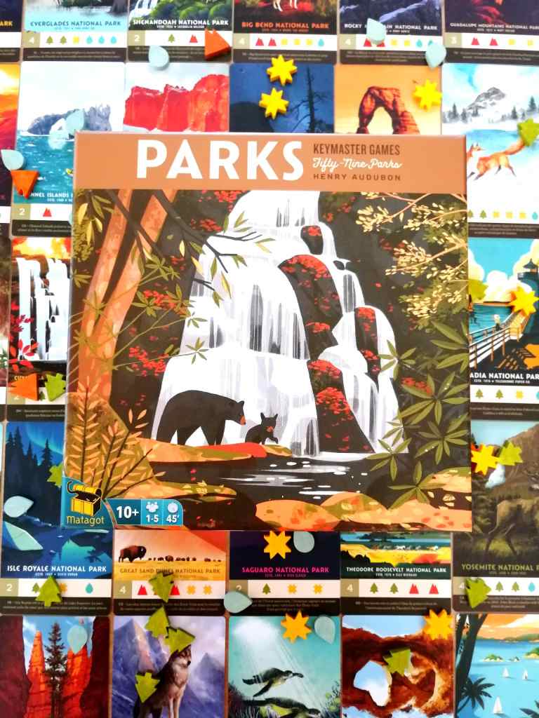 Loin d’avoir parcouru l’ensemble des Parcs Américains, j’ai la chance d’en connaitre quelques uns, sublimes, grandioses et fascinants. C’est donc avec évidence et un enthousiasme rare que je me suis procurée PARKS mais non sans une petite appréhension d’être déçue. Et si la mécanique de jeu n’était pas à la hauteur des promesses des illustrations, qui elles sans aucun doute rendent compte parfaitement de la thématique ? Et si cette boite joliment et intelligemment remplie ne renfermait finalement pas la merveille annoncée ? Les réponses à ces questions se sont imposées très rapidement. Loin d’être d’une originalité grandiloquente, PARKS tient le choc de son annonce visuelle. La ballade ludique est très agréable, d’une grande fluidité et nous ressource de part son impression de tranquillité. PARKS réussit donc le pari de mettre son thème « touristique » au cœur de sa mécanique de gestion de ressources et de collection de cartes. Évidemment, la beauté des illustrations aide à l’immersion. Il n’est pas rare de bousculer un joueur, qui à son tour de jeu, prend le temps d’observer ses Parcs visités plutôt que de faire son action. PARKS, à la manière d’un TOKAIDO ne se joue pas traditionnellement, il s’apprécie, se savoure et se contemple. Le moment est doux et le temps s’arrête le temps d’une partie. Les quelques petites idées originales, comme le chemin d’actions mouvantes ou l’utilisation des gourdes viennent épauler une mécanique générale très classique mais d’une efficacité redoutable. Rien est surprenant mais tout fonctionne parfaitement. PARKS réussit même l’exploit de nous donner une impression de liberté alors que les actions sont restreintes et parfois les choix peu nombreux, d’où ma petite inquiétude sur sa rejouabilité à long terme. Mais, avec ses règles accessibles, son thème plaisant, son superbe matériel et son efficience mécanique, PARKS a tout les atouts pour devenir un classique familial, sinon son prix, peut être un peu rédhibitoire pour un jeu de cette gamme. La beauté et la qualité ont un prix et font partie intégralement de l’expérience de jeu, qui serait sans doute moins délicieuse avec des éléments plus « basiques ». PARKS propose une délicieuse promenade dans les plus beaux coins des États-Unis, parfaitement cohérente, dans laquelle il faudra savoir s’adapter tactiquement tant les joueurs interagissent entre eux en permanence. Un jeu apaisant, à la fois profond et léger, qu’un public très large saura apprécier.