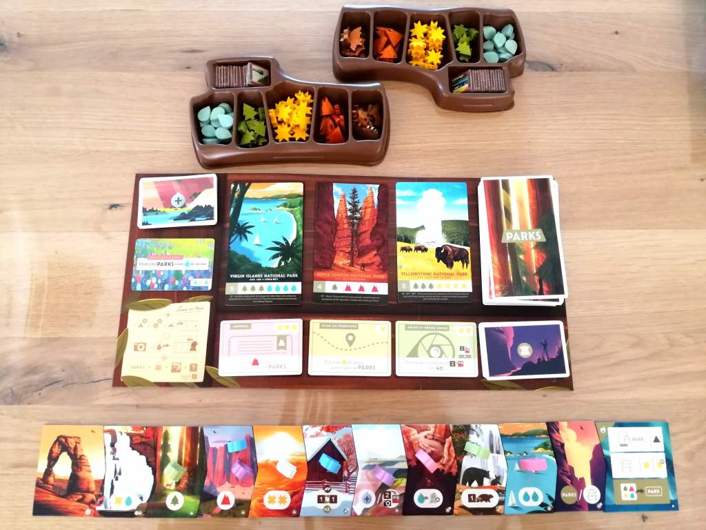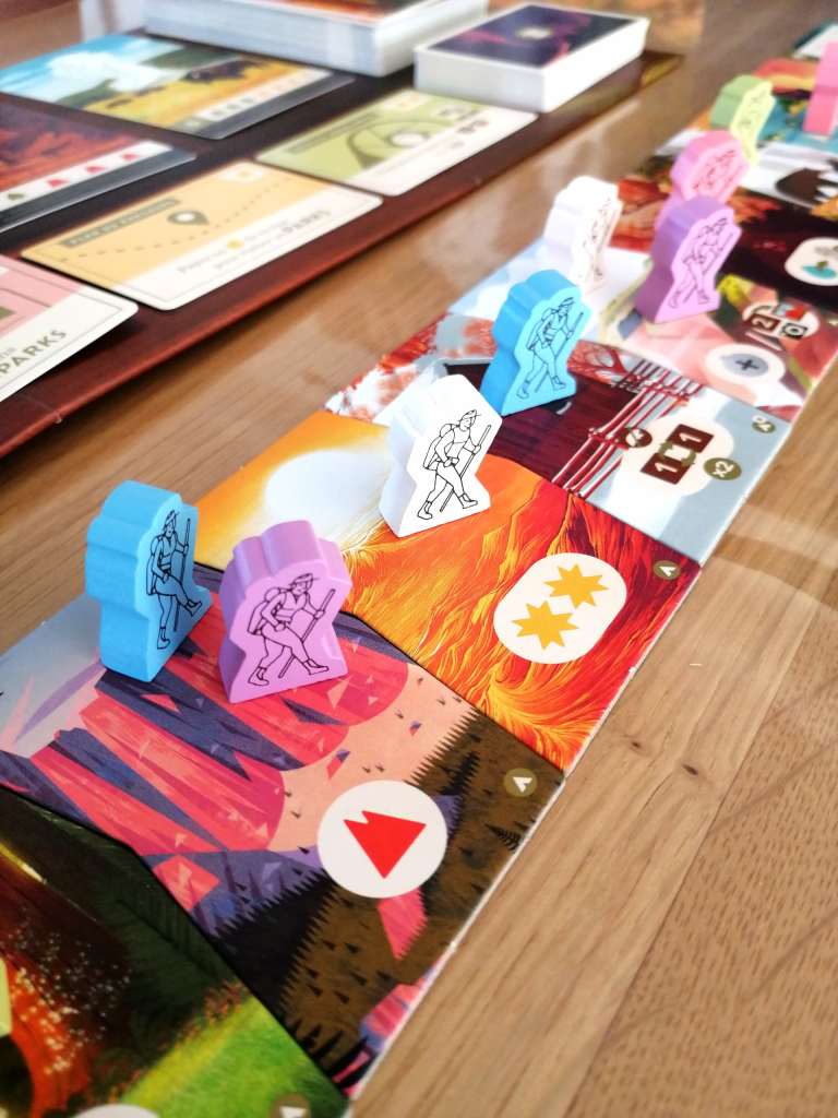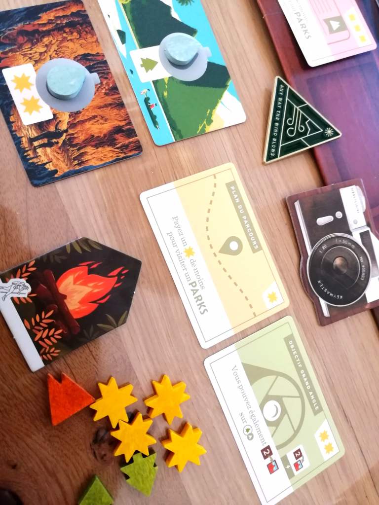 A votre tour de jeu, avancer l’un de vos randonneurs sur une case libre du parcours et effectuer l’action correspondante. Vous aurez l’occasion de récupérer des ressources, faire des photos, vous équiper, obtenir des gourdes ou visiter des Parcs. Pour ce dernier choix, vous devrez défausser les ressources adéquates pour récupérer la carte du Parc visité. Ce sont les cartes Parcs qui octroient le plus grand nombre de points de victoire à la fin du jeu, en plus des photographies prises et de l’objectif personnel éventuellement réalisé. Le joueur ayant obtenu le plus de points de victoire en fin de partie l’emporte.