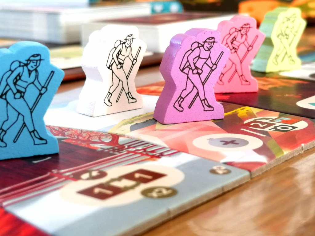 Le jeu se déroule en 4 manches représentant 4 saisons et matérialisées par 4 parcours de randonnées aux cases actions mouvantes d’une manche à une autre.