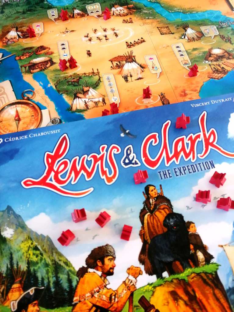 LEWIS & CLARK est l’un des tout premiers jeux « experts » que j’ai eu occasion de tester alors que je balbutiais dans le monde des jeux de société. Et à l’époque, je l’avais trouvé vraiment peu instinctif et difficile à prendre en main. Des années ont passé, mon expérience a grandi… Et sa réédition me tendait les bras. J’avais très envie de redécouvrir LEWIS & CLARK avec des yeux différents, tant j’avais senti à l’époque être passée à côté de quelque chose, juste car ce n’était pas le bon moment. Et mon pressentiment s’est avéré juste dès les premières minutes de la partie… Enfin les « deuxièmes minutes » en réalité car si le livret de règles est très clairvoyant, l’explication de celles-ci se révèlent complexe. LEWIS & CLARK propose tellement de mécanismes associés que l’on ne sait pas par où commencer. On évoque d’abord la Course, objectif principal du jeu, puis les actions sous forme de pose d’ouvriers et enfin la partie « deck-building » pour améliorer nos actions potentielles futures. C’est à ce moment là qu’on commence à remarquer l’air inquiet de nos convives, pourtant joueurs. Mais dès les premiers tours achevés, on comprend comment LEWIS & CLARK fonctionne et nous porte dans un périple subtil et très thématique. Toutes les actions ont une raison d’être et les personnages des cartes sont même historiquement décrits. Le jeu tourne de manière fluide comme une horloge « suisse » alors que les choix et options sont nombreux et qu’il faut trouver le bon équilibre entre la quantité de ressources et d’indiens à posséder sans être pénalisé et le moment de faire telle ou telle action. Car LEWIS ET CLARK exige un excellent sens du rythme pour rester dans la course mais aussi pour profiter de la puissance de certaines actions qui fluctuent selon ce que les adversaires proposent. Des interactions nombreuses donc, dans un jeu très malin, tendu, et globalement original. Si je rajoute à tout ça que les illustrations renforcent le plaisir ludique autant que la qualité indéniable du matériel, et que les nouvelles règles viennent « allégées » le jeu initial en proposant toujours autant d’options tactiques et stratégiques, je pense que l’on ne doit pas être loin de la perfection. Vous l’aurez compris, LEWIS & CLARK est un énorme coup de cœur et est devenu en quelques parties un indispensable de ma ludothèque.