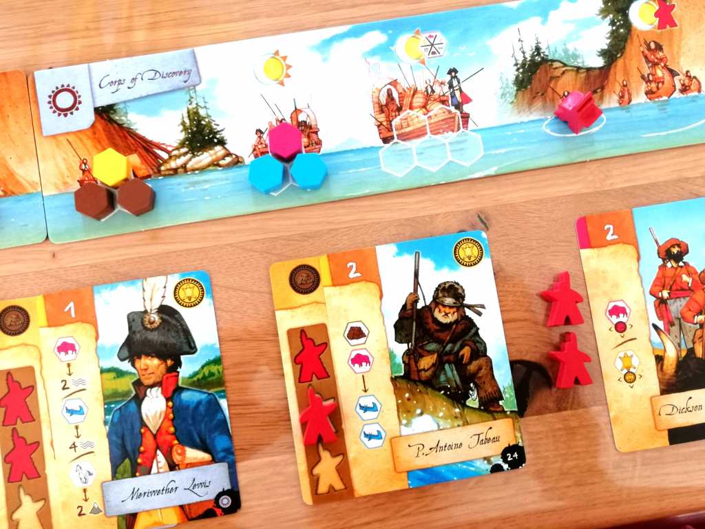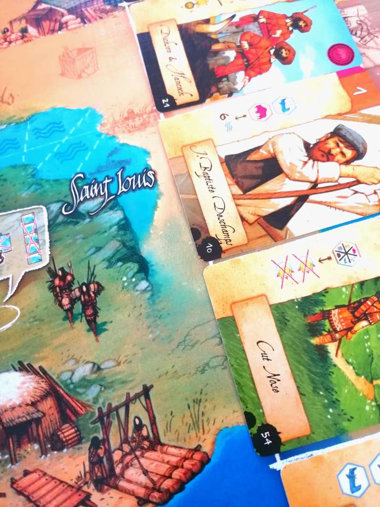 – Réaliser l’action d’une carte personnage jouée devant soi en l’accompagnant d’une autre carte, lui octroyant une « force » (nombre de fois que l’on peut réaliser l’action) représentée par le nombre d’indiens figurant à son dos. Les cartes personnages sont diverses et permettent entre autre de récupérer des ressources, embarquer des indiens mais surtout de faire avancer par divers moyens son pion éclaireur le long du parcours sur l’eau ou dans la montagne.