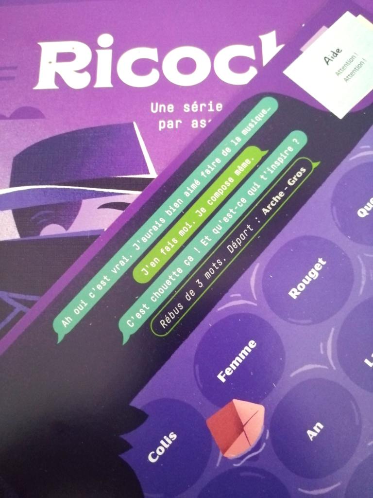 RICOCHET, c’est le jeu que l’on m’a le plus conseillé cet été… Assez réfractaire aux jeux de société en solitaire, souvent peu convaincue par les coopérations de toutes sortes, et pas très adeptes non plus des jeux de « lettres » en général, j’ai eu bien du mal à croire aux recommandations faites de toutes parts. Et pourtant… Tous avaient raison. Je me suis faite avoir par cette petite boîte qui ne paie vraiment pas de mine. Le système de jeu de RICOCHET est ultra malin, et provoque un quelques minutes une multitude de sensations. On passe de la réflexion à l’agacement en quelques secondes, pour ressentir entre les deux de la fierté. Ce sentiment de fierté rend RICOCHET très addictif. On se prend rapidement au jeu en croyant enchaîner « les bons mots ». La fréquence de nos soi-disantes réponses positives est élevée, ce qui nous donne une assurance qu’un seul petit indice peut détruire en quelques secondes. On s’élève pour mieux retomber en quelques sortes ! Ces oscillations de sentiments sont jouissives et assez rarement provoquées dans d’autres jeux. Et que dire de la gloire ressentie à la résolution du Rébus ! Les parties s’enchaînent et les associations d’idées de plus en plus farfelues foisonnent. RICOCHET est un petit bijou de subtilité et d’intelligence dans lequel chaque joueur peut s’amuser à son rythme et ressentir des sensations jusque là quasiment inconnues. Très original et surprenant, il est universel et plaît instantanément à toute personne le découvrant. De la réflexion sans prise de tête, quand on commence à « ricocher », on ne peut plus jamais s’arrêter !