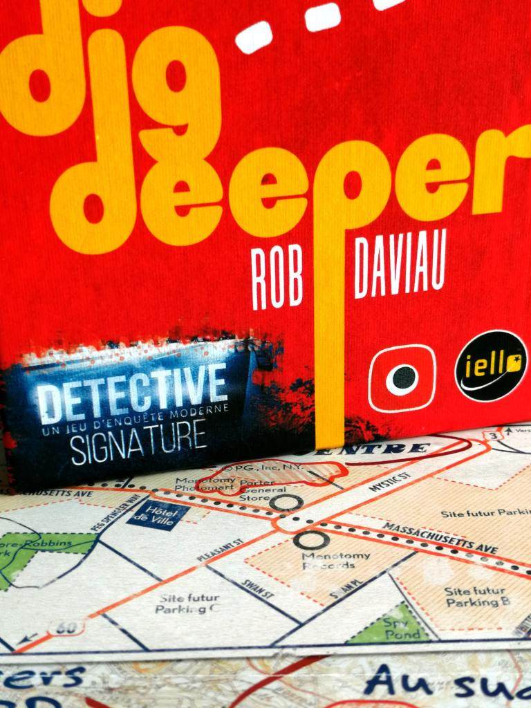 L’exercice de chroniquer sur DIG DEEPER est périlleux entre la volonté de témoigner d’une expérience de jeu et l’obligation de ne rien dévoiler de l’intrigue. Je vais donc tenter de rester suffisamment vague tout en étant précise sur les sensations ressenties lors de ma partie, ou devrais-je plutôt dire de mon expérience. En effet DIG DEEPER n’est pas un jeu comme les autres. C’est un chemin de pensées collectives, une collaboration d’idées amenant les participant à s’immerger totalement au cœur d’une enquête plus que réaliste. Sur ce point, DIG DEEPER est en parfaite cohésion avec DETECTIVE – UN JEU D’ENQUÊTES MODERNES sur lequel il prend nécessairement appui. On retrouve les mécanismes qui ont fait le succès et la singularité de DETECTIVE. La forme reste quasiment identique. Vous allez devoir suivre des pistes diverses et variées, en épuisant peu à peu un paquet de cartes, et en utilisant des moyens techniques modernes afin d’aboutir à la résolution de l’enquête qui vous est proposée. L’expérience est immersive, même si parfois, les longues narrations de la lecture des cartes nous font perdre un peu le fil… Mais tout est contextualisé, très bien décrit et tout est fait pour que vous ayez l’impression d’être au cœur du centre d’investigation. Les quelques changements par rapport au jeu de base (car DIG DEEPER est bien à considérer comme une extension de DETECTIVE, même si l’enquête est parfaitement autonome) concernent surtout les actions à réaliser et le sentiment d’une encore plus grande liberté de recherche, d’ailleurs déstabilisant en début de partie. Les réflexions et déductions réclament de l’exigence, ce qui signifie que l’on ne joue pas à DIG DEEPER par hasard ou lorsqu’il nous reste « deux heures à tuer ». Il demande de réels efforts d’investissement, des prises de notes, des discussions et confrontations de points de vue, des choix importants, pour s’acheminer ensemble vers le « rapport final ». DIG DEEPER se mérite, comme il se savoure et se partage. L’intrigue est subtile tout en touchant des doigts de nombreuses pistes et sujets. La fierté ressentie est forte lorsque les liens se resserrent et que l’équipe croit aboutir à des réponses cohérentes. Alors, évidemment, il est préférable d’aimer les jeux d’enquêtes et/ou les jeux coopératifs… Et encore que… DETECTIVE et son DIG DEEPER associé présentent tellement de fraicheur et d’intelligence qu’ils sauront convaincre les plus réfractaires de ces styles. DIG DEEPER s’inscrit donc comme une « suite alternative » à DETECTIVE, en étant à la fois autonome dans son scénario et dépendant de son matériel. Intelligent et exigeant, il rassemble les joueurs autour d’un but commun en les obligeant à prendre des chemins de traverse nombreux, variés et studieux.