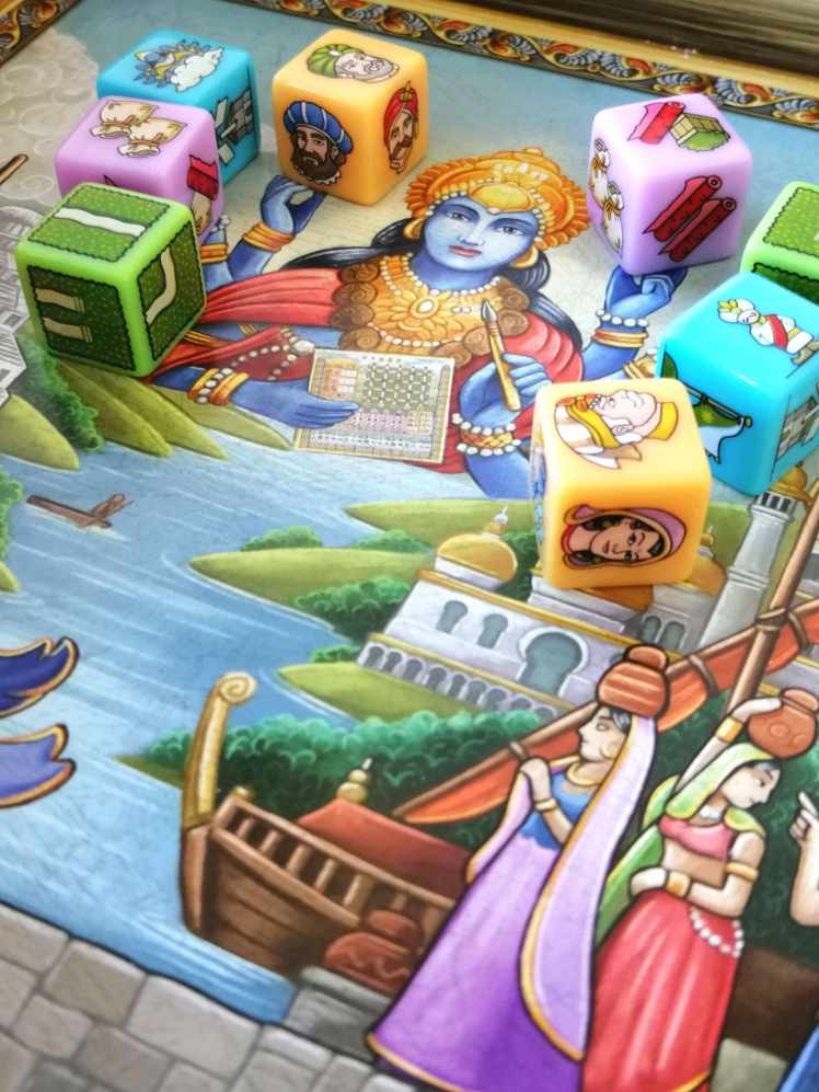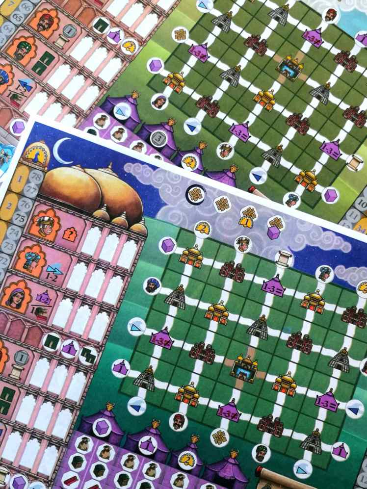 En tant que grande fan du jeu de plateau RAJAS OF THE GANGES, c’est avec une hâte non dissimulée que j’attendais cette formule « Roll & Write », même si je le redis encore une fois, je ne suis vraiment pas la meilleure cliente pour ce « genre » de jeu souvent peu interactif. Déjà, j’ai été surprise par la retranscription presque parfaite du jeu « initial ». On retrouve évidemment l’originalité des conditions de fin de parties et de victoire, à savoir le croisement des pistes opposées de points de gloire et de son niveau d’argent. Les différentes composantes du jeu « initial » sont également conservées authentiquement. Les actions s’articulent autour de la construction des routes de notre « Province », de la construction de bâtiments, de notre avancée sur le fleuve sacré, de la vente de marchandises dans les différents marchés mais aussi dans l’aide précieuse apportée par les personnalités du Palais. Mais c’est surtout dans l’articulation de toutes ces actions que THE DICE CHARMERS excelle. Les combinaisons sont foisonnantes et permettent une montée en puissance progressive très agréable et accélérant les fins de parties. Les bonus sont disséminés un peu partout… à la fin d’une route, après la vente de marchandises de même valeur, sur les pistes de score, après l’utilisation des six conseillers différents ou encore après l’aide apportée par le « Karma », qui d’ailleurs s’avère être bien plus dispensable que dans le jeu de plateau. Les rares recours aux points de karma témoignent d’une tension assez faible sur les choix à effectuer, tellement les possibilités sont nombreuses. Les joueurs ne sont jamais réellement coincés, ce qui peut être un atout considérable comme un signe d’un manque d’interaction. Le « Roll & Write » de toute façon, à part rares exceptions, se base sur des réflexions tactiques plutôt auto-centrées. Je ne vais donc pas lui jeter la pierre sur ce point. THE DICE CHARMERS fait parfaitement le job. Il propose un défi intelligent et subtil tout en utilisant une mécanique des plus accessibles. Le matériel est très beau et agréable même si les informations et les couleurs nombreuses de la fiche personnelles des joueurs, d’ailleurs toutes deux indispensables au bon fonctionnement du jeu, rendent parfois la lecture difficile. Il est par exemple quasiment impossible de suivre l’évolution de nos adversaires. THE DICE CHARMERS « charmera » les amoureux des « Roll & Write » exigeants, en proposant une « course aux points » singulière et une expérience de jeu à la fois d’une légèreté mécanique redoutable et d’une belle profondeur tactique.