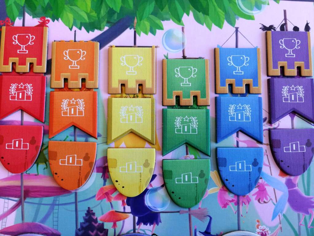 – Le Résultat. Les joueurs vérifient s’ils ont parié sur les licornes du trio de tête. L’argent mis en jeu est perdu si les paris s’avèrent être des échecs. Par contre, si un pari « Placé » est réussi (sur le podium), le joueur double sa mise et obtient 3 ou 2 points de victoire selon la tuile choisie lors de la phase de Préparation. Si un pari « Gagnant » est réussi, le joueur multiplie sa mise par la « côte » de la licorne et obtient 5 points de victoire. A la fin de cette phase, chaque joueur paie une « Taxe de Gloire » en fonction du nombre de points de victoire qu’il possède. Enfin les côtes des licornes sont ajuster en fonction du résultat de la Course.