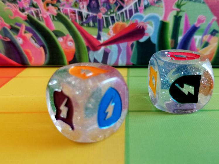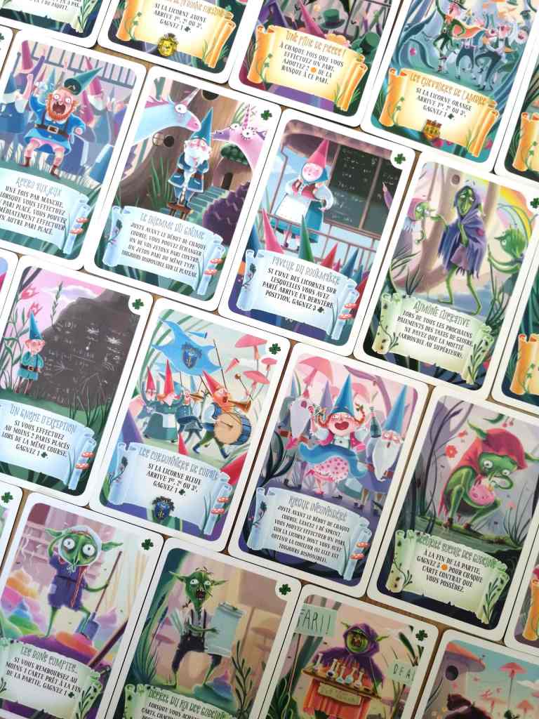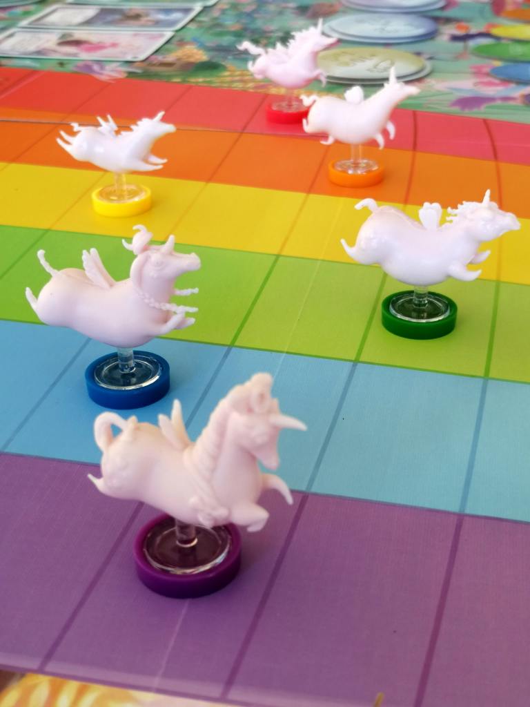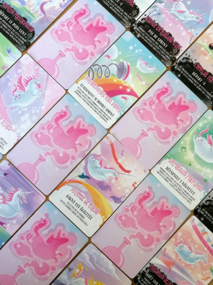 – La Course. Après que les cartes « Magie » aient été révélées, et leurs malus/bonus appliqués, des cartes « Course » sont retournées une à une, faisant avancer les licornes d’un certain nombre de cases jusqu’à ce que toutes les licornes franchissent la ligne d’arrivée. Le dé « Sprint » permet à deux licornes d’avancer davantage après chaque carte « Course ».