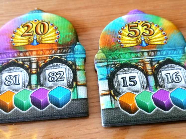 – Holi, le Festival des Couleurs. Des tuiles « Holi » sont positionnées sur les pistes de score. Le premier joueur a en atteindre une déclenche un Festival permettant à chaque joueur d’obtenir un bonus selon son classement actuel sur la piste correspondante. Le dernier joueur se « sert » en premier et récupère la tuile « Holi » lui permettant par la suite de changer la couleur d’un de ses dés lors d’une action.