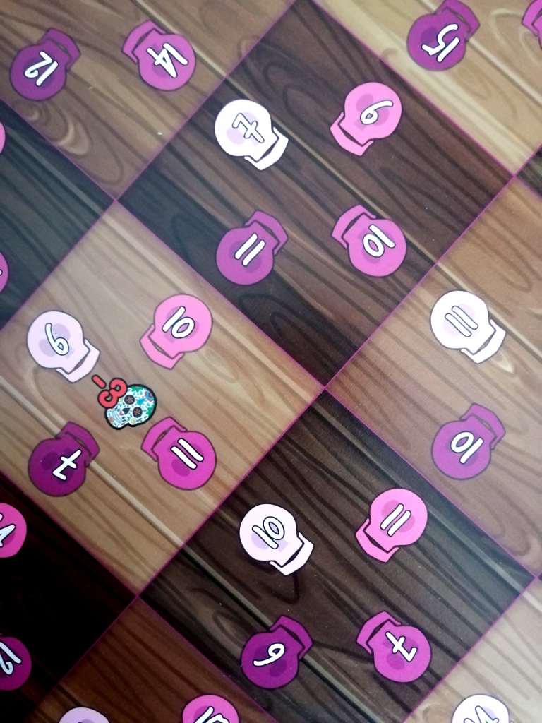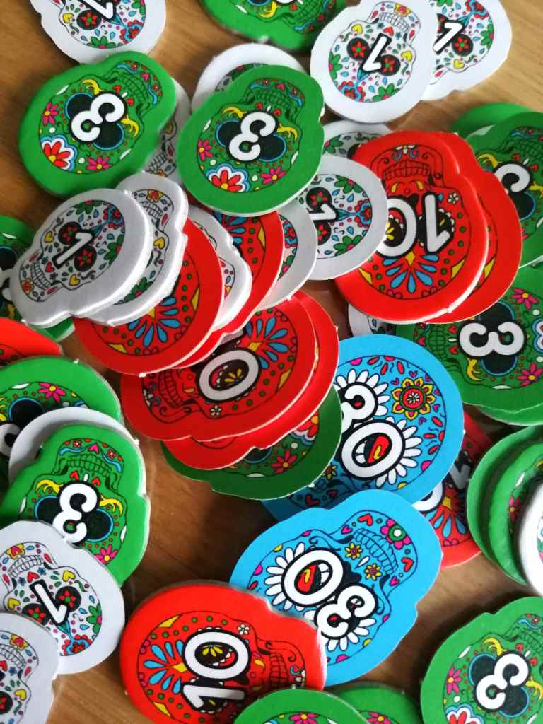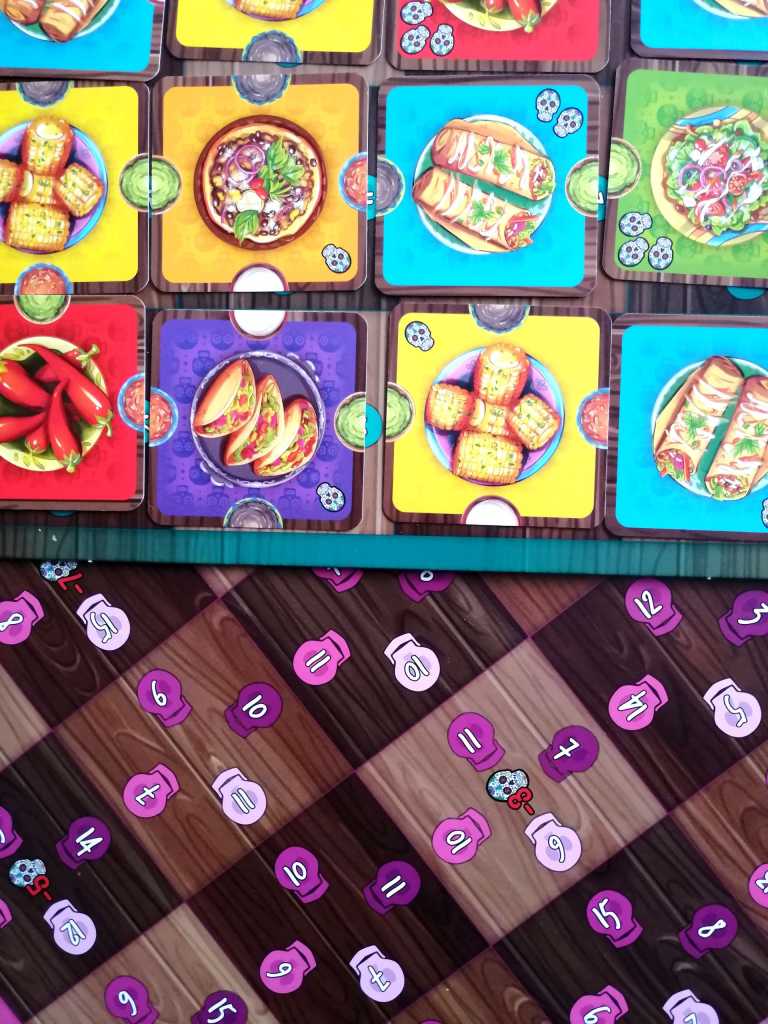 – Placement du plat sur la table et attribution des points. Le joueur ayant remporté l’enchère place le plat sur la case correspondant à son offre. Il peut le positionner dans n’importe quel sens. Il gagne instantanément un point pour chaque tête de mort présente sur la carte et trois points pour chaque bol de sauce qu’il a réussi à réunir, composé de deux moitiés de même couleur. Par contre, il perd un point par bol de sauce incomplet ou composé de deux couleurs différentes.