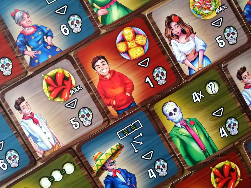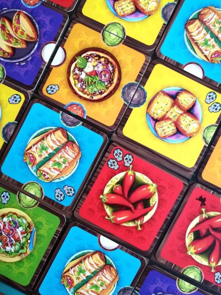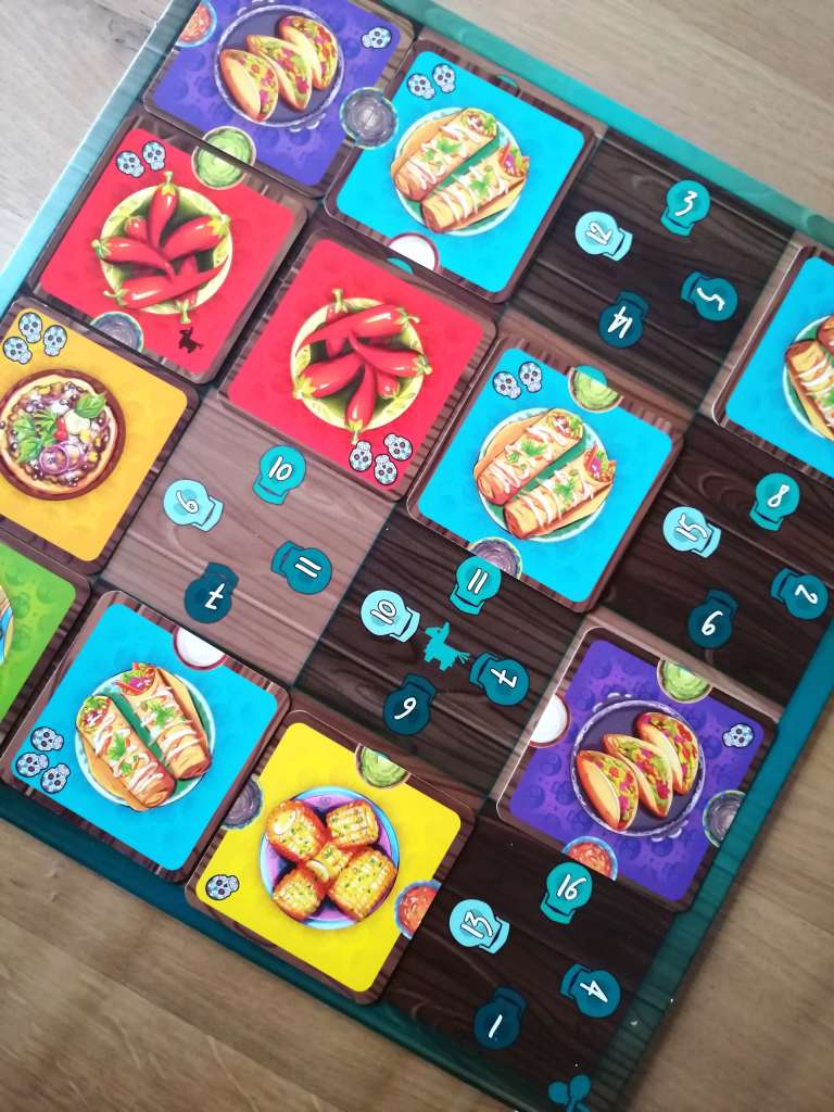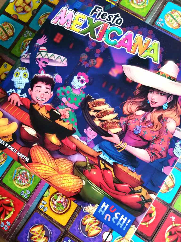 FIESTA MEXICANA est une belle surprise de ce début d’année. Malgré ses couleurs vives et pétillantes, sa sortie se veut plutôt discrète. Et pourtant, le jeu possède de nombreuses qualités et mérite qu’on consacre du temps et de l’énergie à vanter son potentiel. Déjà, sa prise en main est instantanée. Les règles sont très simples et la mise en place prend quelques secondes. En ce sens, il est très facile à sortir, et ce, quelque soit le public autour de la table. De par son thème festif et culinaire, et sa mécanique de placement tactique accessible mais très maligne, FIESTA MEXICANA se destine principalement aux familles souhaitant passer un agréable moment, même si les plus joueurs d’entre nous y trouveront également leur compte. Effectivement, le système d’enchères qu’il propose, à la fois épuré et original, constitue un véritable casse tête, que l’on peut résoudre de manière assez instinctive sans se faire trop mal à la tête, ou au contraire, en analysant l’ensemble de nos possibilités et celles de nos adversaires pour rentabiliser au maximum nos plateaux personnels. J’aime beaucoup l’idée que les jeux puissent, de manière intrinsèque à leur mécanique, laisser le choix à leurs participants de la manière dont ils vont s’en accaparer. Et FIESTA MEXICANA permet cet exercice à merveille. Il est à la fois léger et profond et laisse la possibilité aux joueurs du degré de calcul et de réflexion qu’ils veulent y projeter. Le cœur du jeu réside dans la rotation des « tables » permettant l’apparition de nouvelles valeurs d’enchères. Ce système est à la fois simple et ingénieux, multiplie les options tactiques et oblige à des interactions fortes et permanentes. Il sera effectivement primordial de garder un œil bien ouvert sur les possibilités d’enchères de nos adversaires pour tenter de remporter les plats les plus « rentables » selon nos objectifs personnels mais aussi selon les points de victoire potentiellement récupérables immédiatement. FIESTA MEXICANA est une vraie réussite ludique. Ses nombreuses interactions et la manipulation de son matériel permettent de s’amuser tout en proposant un exercice d’optimisation intelligent. Les parties sont rapides et les tours de jeu très dynamiques. Les « Puzzles » se constituent sans aucun temps mort dans une très bonne ambiance, représentative de la thématique, plutôt très bien concrétisée pour un jeu abstrait. Même si les illustrations auraient pu être un peu plus modernes, l’essentiel est que le jeu le soit, en dépoussiérant de manière considérable les jeux de placements. FIESTA MEXICANA est étonnant de simplicité et d’efficacité. Il laisse une chance à tous les joueurs de pouvoir l’emporter, dans un décompte final souvent tendu, et qui en appelle beaucoup d’autres.