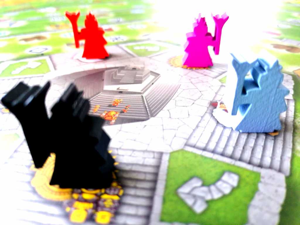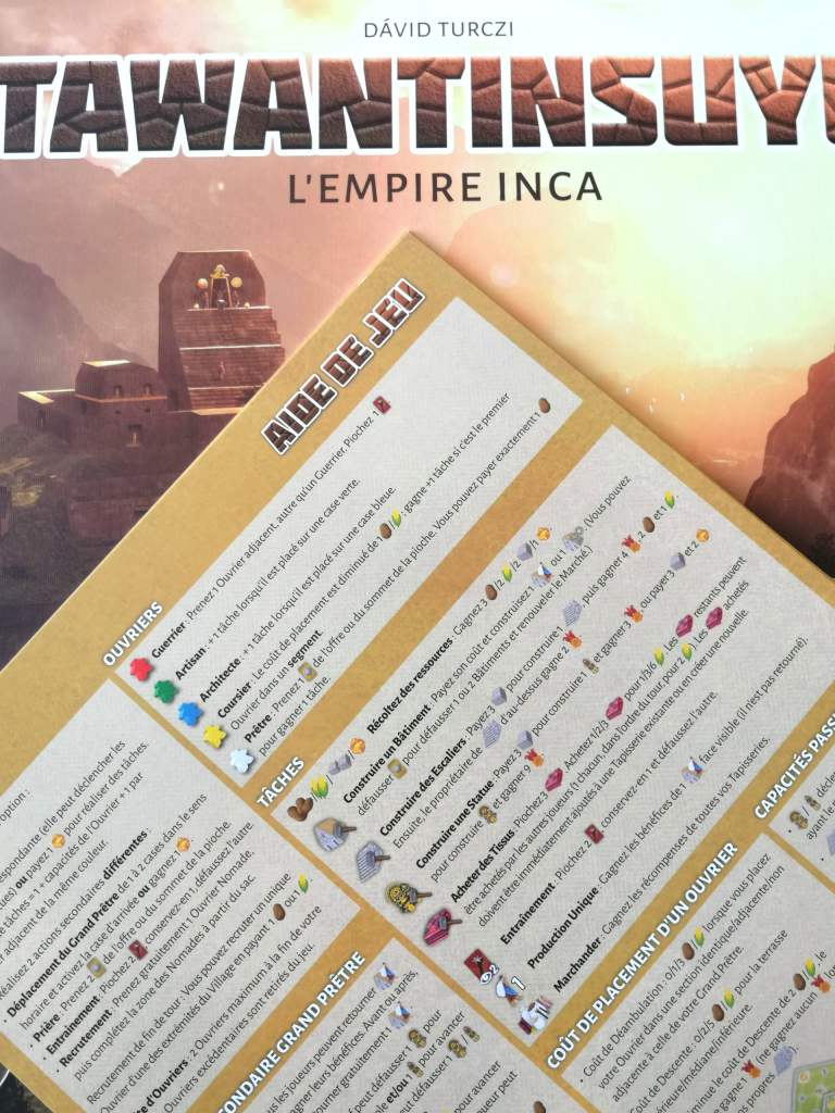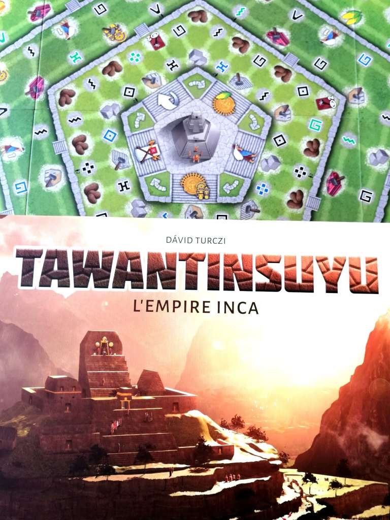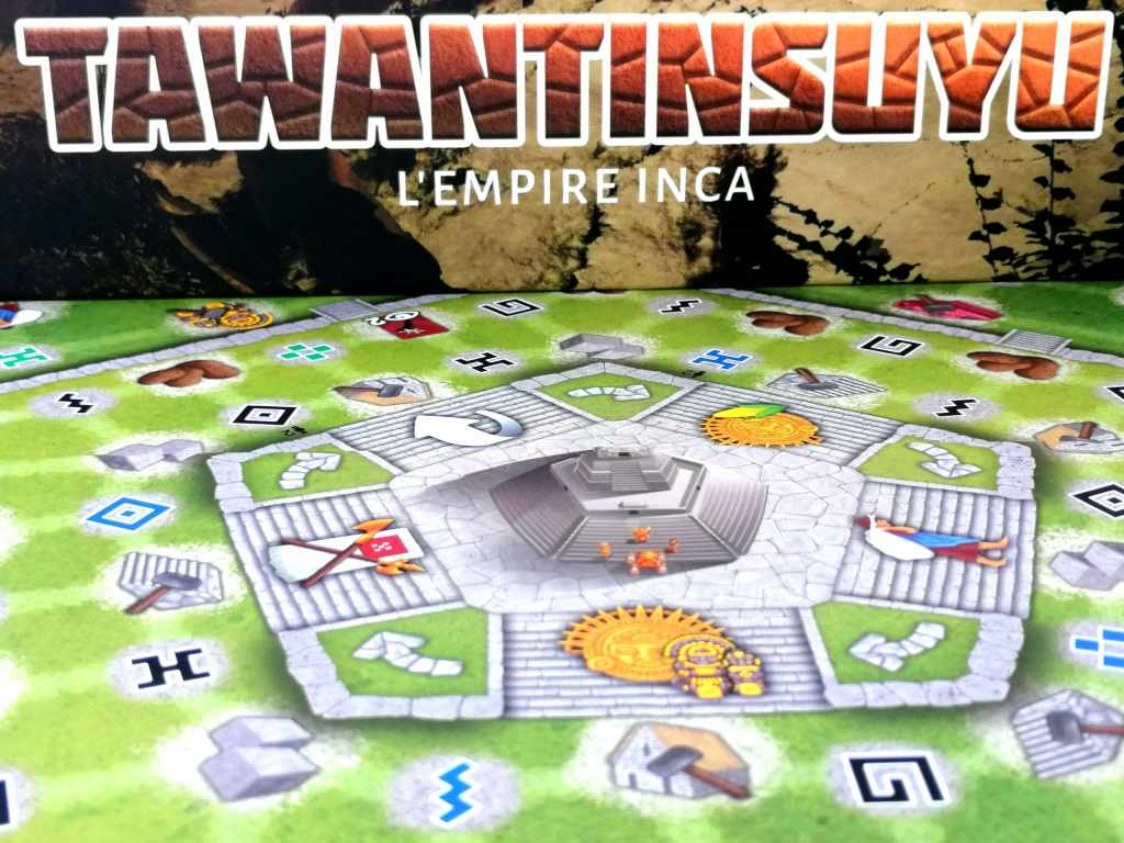 Rien qu’avec son nom, TAWANTINSUYU promet de l’exotisme et de l’aventure. Contrairement à son titre évocateur, ce n’est pas à travers sa thématique, assez vite oubliée, que le jeu va nous faire voyager mais plutôt dans une mécanique parsemée de petites découvertes et originalités. En effet, TAWANTINSUYU surprend dès les premiers instants par la quantité d’informations impressionnantes à ingurgiter, d’autant plus qu’elles sont assez différentes de ce que l’on peut avoir l’habitude d’appréhender. D’ailleurs, l’aide de jeu, qui s’avère très vite indispensable, utilisant une écriture minuscule sur un format A4, ne laisse aucun doute sur le type de jeu auquel nous avons à faire. TAWANTINSUYU s’adresse aux joueurs experts, mais finalement pas tant pour la mécanique, qui au bout de quelques tours de jeu devient étonnamment fluide et assez clairvoyante mais plus par le degré de réflexion qu’il impose à chaque action. Des actions, si nombreuses, que les joueurs seront noyés, lors des premiers tours, dans les choix possibles et surtout dans leurs utilités stratégiques sur le long terme. Dans le fond, TAWANTINSUYU apparait plutôt classique. Il s’agit de récupérer des ressources afin de pouvoir les défausser et ainsi construire principalement des bâtiments, statues ou escaliers, pourvoyeurs de points de victoires et prometteurs d’ une aide précieuse pour le reste de la partie. C’est dans la forme que le jeu se distingue fortement. L’action principale de placement d’ouvrier définitif, plus ou moins coûteuse selon le lieu, permettant la réalisation de « tâches » différentes et plus ou moins nombreuses selon le type de « meeple » posé, l’adjacence éventuelle d’un « meeple » de même type, et la couleur de l’emplacement, est un véritable casse tête abstrait, original et jubilatoire. Mais la singularité de TAWANTINSUYU vient également du fait que les deux actions secondaires, pouvant substituer l’action principale, deviennent très rapidement des objectifs prioritaires pour les joueurs autour de la table. Elles seules peuvent permettre de « grimper » les marches du temple pour obtenir de précieux points de victoire et de réaliser des conquêtes afin de devenir majoritaire dans les différentes régions lors de l’organisation des trois festivals. Il est difficile de décrire en détail toutes les subtilités de TAWANTINSUYU tant le jeu est riche, complexe et complet. En effet, il concentre un nombre impressionnant de paramètres pesant fortement dans la balance du plaisir ludique des « gros » joueurs. Les interactions sont intelligentes, bien présentes et jamais frontales. Il est possible de combiner des effets et des actions à merveille. Le matériel est très agréable et de belle qualité. Les phases de « scoring » prennent en compte de nombreux axes de développement avec même une pointe de majorité. On s’étonnera, par contre, de la présence assez forte du hasard dans un type de jeu qui, d’habitude, tente de le réduire à néant. Une chose est certaine, c’est que les parties sont plutôt rapides pour un jeu de ce type, et que de ce fait, chaque décision est d’une importance capitale, ce qui rend l’expérience de jeu très tendue. TAWANTINSUYU nous transporte avec beaucoup de plaisir dans une aventure ludique d’une grande finesse qui nous rappelle en même temps quelque chose de déjà vécu et de complètement inconnu. Son équilibrage parfait est une de ces plus grandes forces lors de notre voyage tourmenté et agréable à la fois. Le jeu crée de l’inconfort et une frustration permanente de ne jamais pouvoir effectuer réellement l’action parfaite tout en étant jamais bloqué tant les possibilités sont nombreuses. C’est une sensation que j’affectionne particulièrement. Et même si, du fait de son exigence, l’ambiance autour de la table est d’une froideur extrême, contrairement au thème ensoleillée qu’il se veut représenté, TAWANTINSUYU nous réchauffe le cœur et nous apporte à peu près tout ce que nous en attendions.