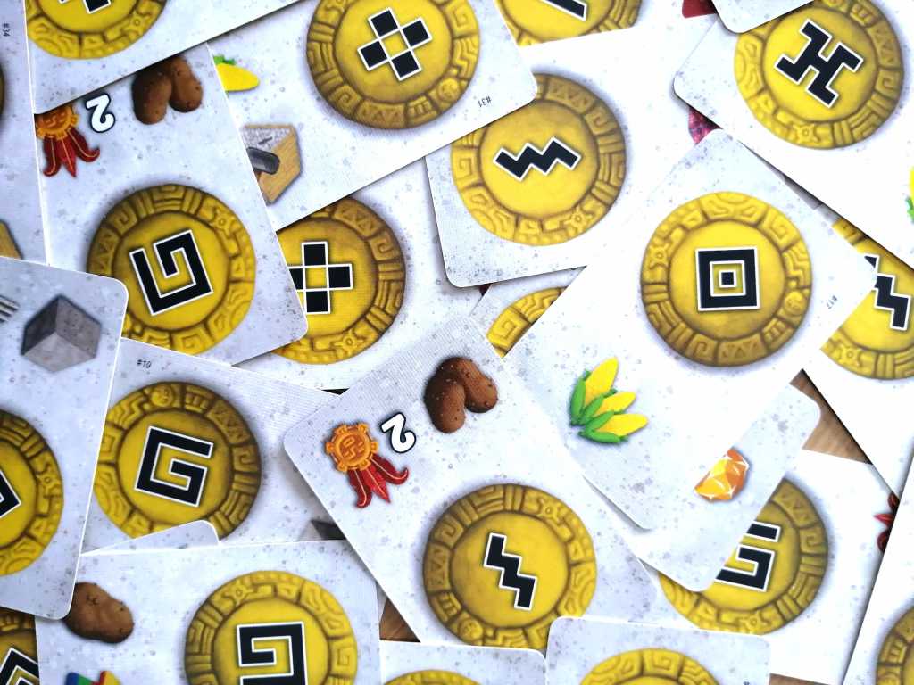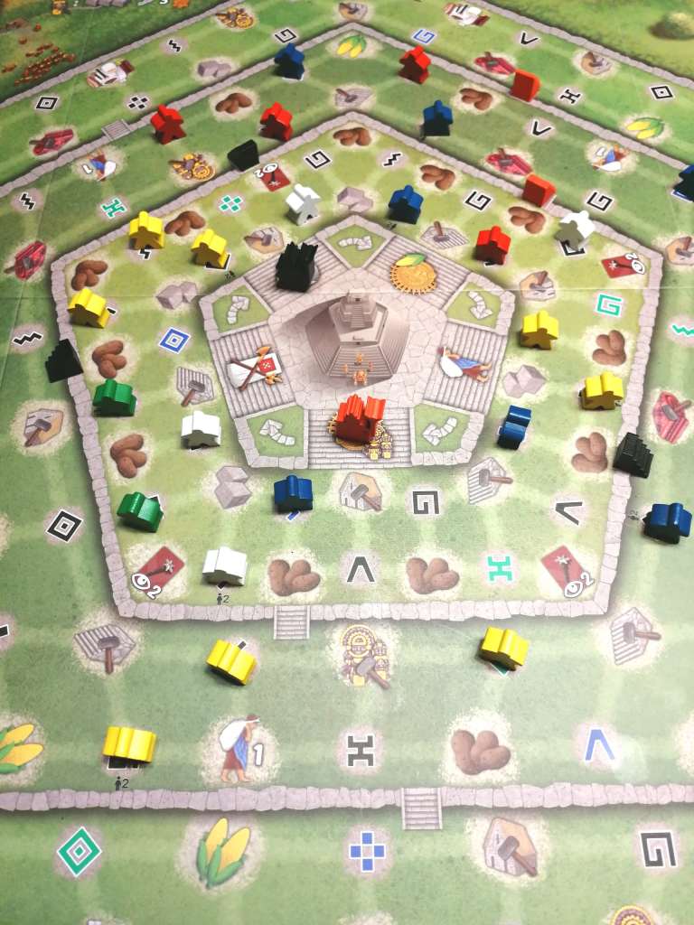 – Placer un ouvrier sur le plateau de jeu en payant une carte « Dieu » représentant le même symbole que l’emplacement visé ou une pépite d’or. De plus, le joueur doit payer de la nourriture selon l’étage et la section de pose de son ouvrier. Selon le type d’ouvrier placé, le lieu ou encore l’adjacence possible d’ouvriers de même type, le joueur multiplie les tâches qu’il peut réaliser. Les trois tâches possibles encerclent l’ouvrier posé. Elles permettent la plupart du temps de récupérer des ressources, construire des bâtiments permettant d’améliorer certaines compétences ou d’obtenir une production ponctuelle de ressources, de bâtir des escaliers permettant de réduire les coûts de pose des ouvriers, d’ériger des statues pourvoyeuses de points de victoire et utiles pour « grimper » sur la piste du Temple, d’acheter des Tissus ou d’activer leurs récompenses et de piocher des cartes « Armée ».