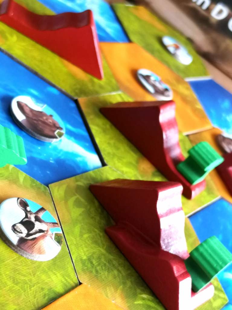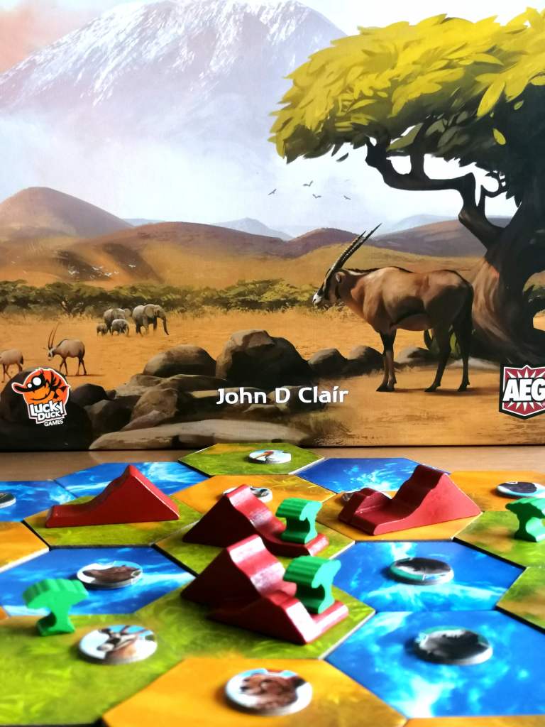 ECOS : CONTINENT ORIGINEL avait tout pour me plaire. Son thème, dans un premier temps, de reconstruction d’un « écosystème » en Afrique Sauvage m’attirait beaucoup. Son matériel, de grande qualité et particulièrement agréable, me donnait l’eau à la bouche. J’apprécie beaucoup la constitution d’une zone de jeu commune par la pose de tuiles, alors, lorsque j’ai pu lire ça et là que le jeu s’apparentait à un « AUGUSTUS en jeu de plateau » ou à un « AUGUSTUS pour gameurs », j’étais convaincue et séduite avant même d’avoir commencé ma première partie. Et malheureusement ma déception fut grande. Non pas que le jeu soit mauvais… Au contraire, il a un fort potentiel et emprunte à AUGUSTUS sa mécanique géniale et jouissive de « Loto tactique ». Mais ce système de jeu tombe quelque peu à plat dans ECOS, qui se veut stratégique et sérieux en s’appuyant sur une mécanique légère et surtout beaucoup trop hasardeuse. Le pari d’associer ces deux aspects était franchement osé. Mais il faut bien reconnaitre que la proximité mécanique avec AUGUSTUS oblige à la comparaison, qui ne tourne pas à son avantage. Là où AUGUSTUS provoque une attente à chaque tirage de jetons, et présente un aspect tactique très malin dans une ambiance virevoltante, ECOS nous plonge très vite dans des prévisions stratégiques « autistiques », peu contrôlables et finalement assez ennuyeuses. Les règles de jeu sont plutôt accessibles, même si leurs explications auraient pu être plus limpides. Et pourtant, les difficultés commencent dès le début de partie, avec un très grand nombre de cartes en main… On se retrouve rapidement dans le flou pour choisir de jouer ou d’activer certaines cartes plutôt que d’autres… Les paquets de cartes de départ, assez inégaux entre eux, ne nous aident pas beaucoup, tout comme la rotation des cartes et certaines explications d’actions peu intuitives. Pourtant, l’envie de faire des combinaisons entre les capacités des cartes est grande et les joueurs comprennent très vite que cet aspect, étant le cœur du jeu, se révèle indispensable pour accumuler de nombreux points de victoire. Mais, entre le hasard de la pioche et le nombre de cartes proposées, il sera difficile et long de se construire un moteur efficace. Du coup, le jeu perd peu à peu de son intérêt jusqu’à devenir répétitif et sans objectif vraiment visible et lisible. Pourtant, ECOS en a sous le capot. Et c’est pourquoi ma frustration et déception sont si grandes, car lorsque les combinaisons se réalisent enfin, le jeu devient redoutable et interactif. Il propose un aspect léger de conquête de territoires et beaucoup d’opportunisme à se servir de ce que les autres ont pu construire. ECOS devient alors plus « incisif », voire même « agressif » et tendu. Ainsi, il faut pouvoir continuer à engranger des points de victoire avec notre propre moteur tout en détruisant celui des autres. Cela peut prendre la forme d’attaques d’animaux vraiment jouissives, ou de constitutions de territoires plaisantes et enfin clairvoyantes. Tout devient alors bien plus intéressant et immersif. Une histoire prend enfin vie devant nos yeux. La « faune » et la « flore » deviennent palpables pour notre plus grand plaisir. Mais ces moments se faisant attendre, ECOS se prend un peu les pieds dans le tapis, en « copiant » une mécanique à l’origine « fun », pour en faire un jeu se voulant plus « joueur ». Le matériel, pourtant très agréable, n’arrive pas à compenser des erreurs d’édition qui rendent le jeu plus compliqué qu’il ne l’est. Malgré cela, ECOS reste plaisant pour faire une partie de temps en temps, à condition de na pas être impatient et réfractaire à l’importance du facteur « chance ».