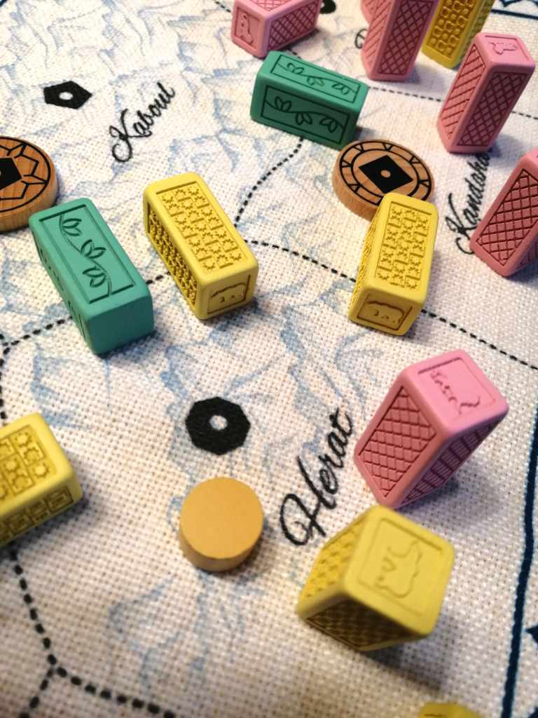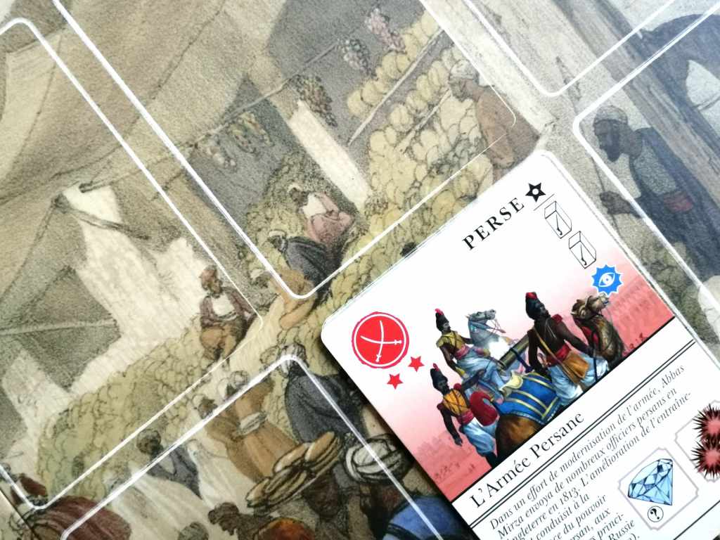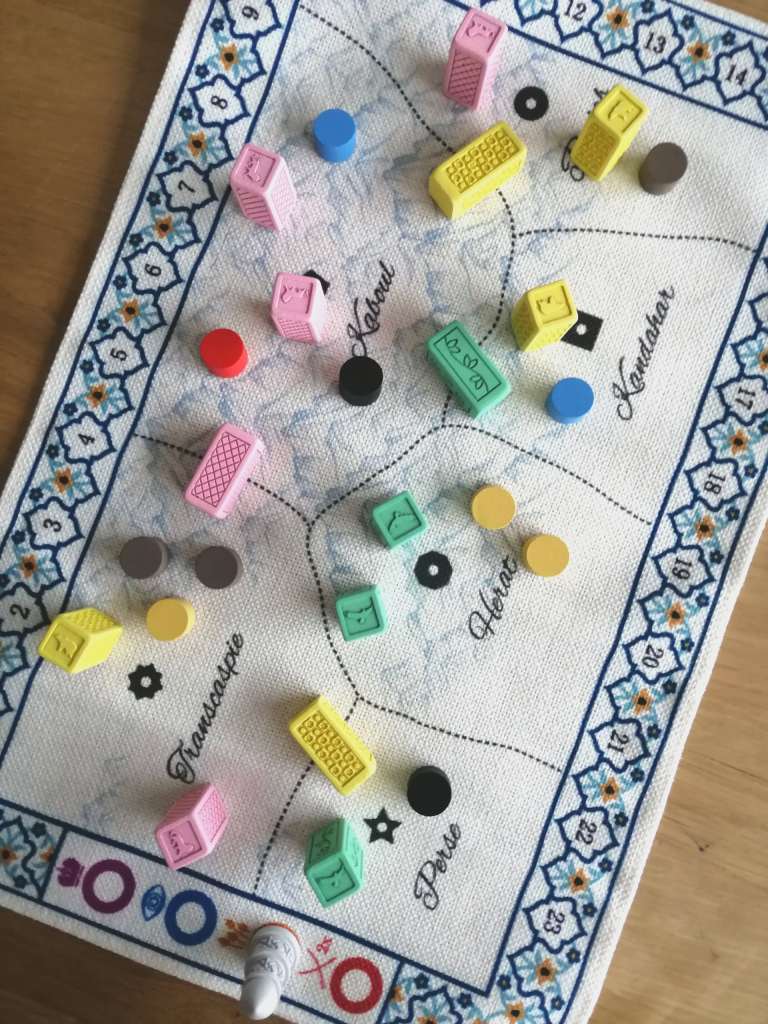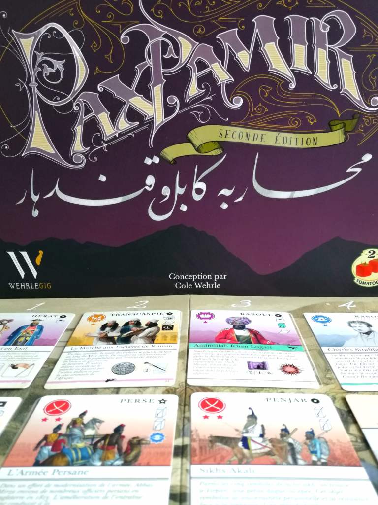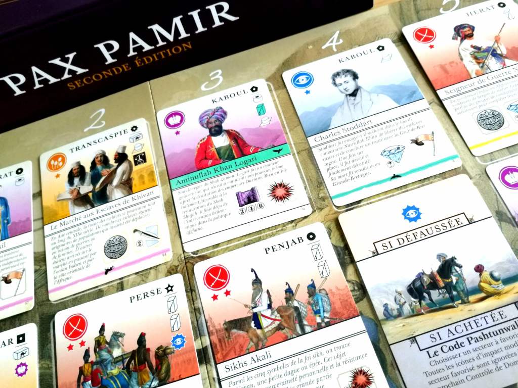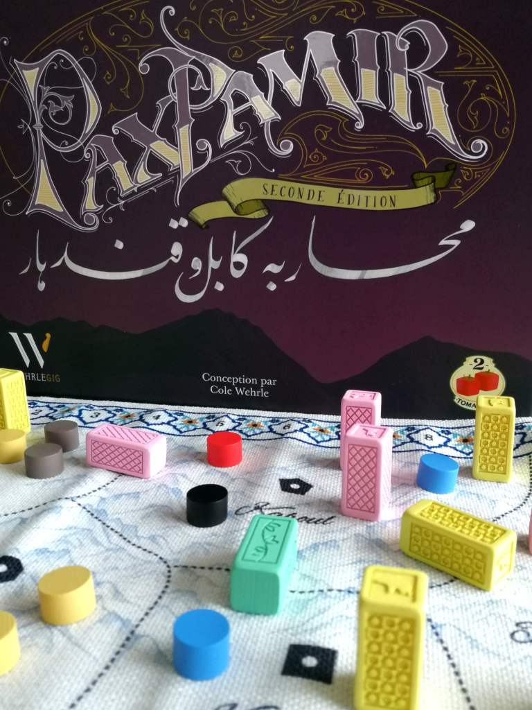 S’il y a bien un jeu pour « Barbus » qui a marqué la toute fin d’année 2020 par sa réédition en VF, c’est PAX PAMIR… Et force est de constater que je suis bien moins « barbue » que je le pensais tant l’expérience de jeu fut, à chaque partie, laborieuse et déstabilisante ! Trêve de caricature, j’avoue avoir craqué pour ce jeu surtout pour sa thématique et avant tout pour la beauté de son matériel, qui donnait un petit air naïf à son côté « expert » que je pensais accessible pour moi et mes camarades de jeu plutôt « costauds » d’habitude. Mais les muscles cérébraux nous ont quelque peu manqués pour affronter la « bête » ! Car si les actions sont rapidement compréhensibles et les pictogrammes très lisibles, PAX PAMIR est inondé de subtilités réglementaires en tout genre qui nous ont bien « barbées » (sans mauvais jeu de mot…). A chaque action réalisée, il faut penser à de multiples petits « trucs » à faire sous peine de complètement « truffer » la partie. Ces points de règles alambiqués sont partout et demeurent essentiels. Du coup, les premières parties se font le nez dans la règle, assez mal fichue au passage, et ne permettent pas de prendre un plaisir ludique démentiel. Et cela provoque une frustration énorme car PAX PAMIR possède un potentiel de « dingue » assurément. Il est avant tout un jeu de gestion et de combinaisons de cartes se manifestant par de l’occupation de territoires donnant lieu à des interactions constantes et des jeux de pouvoirs entre joueurs. Les luttes pour maintenir et accroître son influence sont nombreuses, sur tous les plans, tendues et palpitantes. Mais faut-il encore maîtriser parfaitement l’ensemble des paramètres et rassembler autour de la table au moins 4 joueurs (configuration optimale) très très experts et de même niveau, sinon les déséquilibres peuvent très vite arriver. PAX PAMIR est extrêmement riche et complet, en plus de sa singularité. Il propose aux joueurs de s’adapter en permanence tactiquement, bien plus que d’avoir des plans stratégiques à long terme, très difficiles à cerner. Il faut savoir profiter d’opportunités tout en maîtrisant le plus possible les faits et gestes adverses. Tout ça est d’une très grande subtilité. Une telle exigence qui m’a beaucoup déroutée et m’a quelque peu enlevée le côté ludique d’un jeu beaucoup trop cérébral pour moi. Je n’ai pas saisi les enjeux et tout était bien trop flou dans mon esprit pour que je sache exactement quoi faire et à quel moment. Je ne doute pas que PAX PAMIR soit exceptionnel aux yeux des joueurs qui l’ont apprivoisé. Sa rejouabilité est impressionnante et les changement fréquents de situation lui assurent une grande variété dans la dynamique du jeu. De plus, le thème, original, transpire dans toute l’organisation de la mécanique. C’est un des très gros points forts de PAX PAMIR avec sa proposition de gestion multiple. Un jeu sans aucun doute excellent, auquel je ne pardonne pas de m’avoir laissé aux portes de ses frontières Afghane.