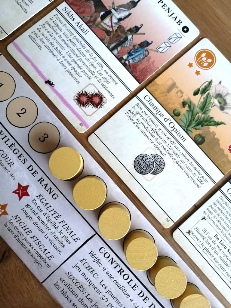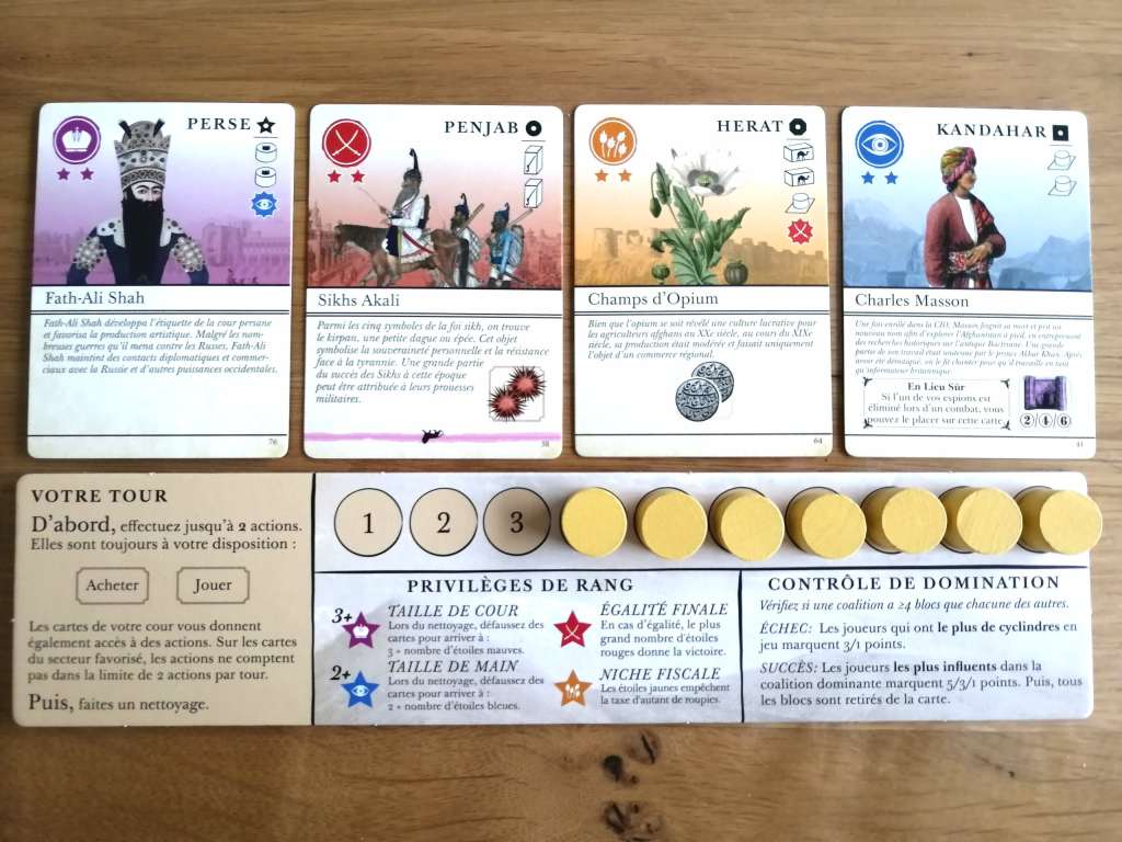 – Jouer une carte et appliquer les effets de pose. Il est ainsi possible de placer une route ou une armée de sa « coalition », une tribu sur la région qu’indique la carte, mais aussi de récupérer deux roupies, de placer un espion sur n’importe quelle carte de même région, ou de changer le climat politique. Si jamais un adversaire « Gouverne » la région de la carte jouée, il faudra alors lui verser un « pot de vin » égal au nombre de tribus qu’il y possède. Si jamais la carte ajoutée est un « Patriote » correspondant à une autre « coalition », le joueur est dans l’obligation de changer de « coalition » et perdre ainsi les compatriotes, récompenses et cadeaux qu’il avait pu accumuler. Les cartes déposées forment la « Cour » des joueurs et sont de quatre types correspondants au climat politique du Pays : économique, militaire, politique ou espionnage. Les cartes dans la « Cour » de chaque joueur, selon leurs types, octroient des avantages comme l’augmentation du nombre de cartes en main, dans sa « Cour », départagent les égalités ou protègent d’une taxation trop forte.