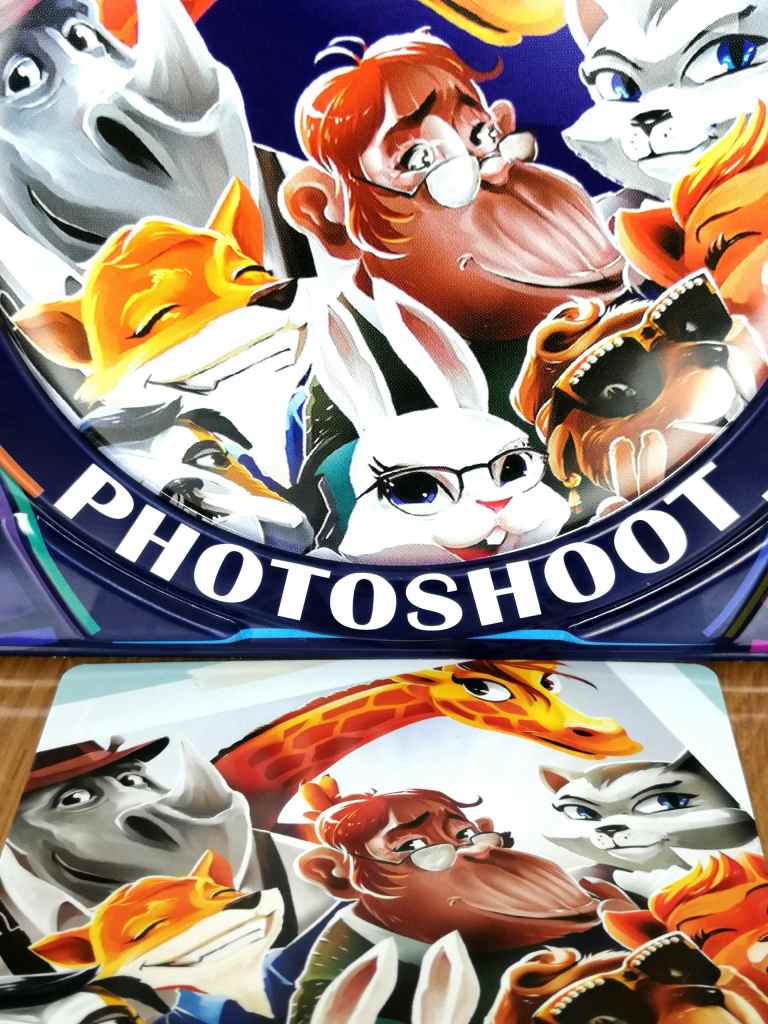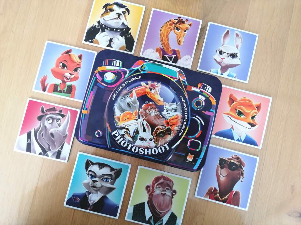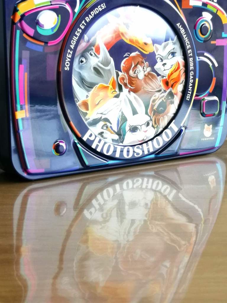 Depuis la sortie de leur tout premier opus, la ligne éditoriale de Funnyfox se veut joyeuse et pleine d’entrain tout en proposant des mécanismes accessibles, piquants et malins. Avant-gardistes, leurs jeux très colorés et malicieux se savourent avec encore plus de plaisir dans ce monde devenu bien triste depuis quelques semaines. PHOTOSHOOT n’échappe pas à la règle que semble s’être fixée l’éditeur. Soignant particulièrement l’esthétisme, la découverte du jeu commence par sa surprenante boîte métallique en relief prenant la forme d’un appareil photo et mettant au centre de son objectif les différentes personnalités animalières que composent le jeu. Le packaging ne pouvait pas être meilleur ! C’est concret, attendrissant et très malin. Des adjectifs qui s’appliquent également à la mécanique du jeu. En effet, PHOTOSHOOT propose de photographier un groupe de personnalités, qu’il va falloir « placer » sous contraintes temporelles et spatiales et sans aucune communication avec ses partenaires. Ce silence obligatoire amène de nombreuses incompréhensions ou quiproquos que l’équipe adverse s’empressera de noter. Il faut aller vite, et dans la précipitation, les joueurs défont ce que les autres construisent sans aucun état d’âme ou sans même y prêter attention tant les logiques des joueurs peuvent être différentes. Tous ces mouvements contradictoires sont source de rires et créent une ambiance à la fois électrique et bon enfant. Mais tout serait beaucoup trop simple si PHOTOSHOOT ne permettait pas d’accroitre progressivement la difficulté de l’exercice en incorporant des « effets » de jeu sous forme de « contraintes » à appliquer aux déplacements de certains personnages. Et c’est dans cette proposition que le jeu devient encore plus réaliste et touchant en réussissant à personnifier chaque personnalité de telle façon que leurs « effets » associés collent avec l’idée que l’on pouvait se faire de l’animal en question. C’est encore une fois très intelligent et permet aux plus « jeunes » joueurs de saisir l’histoire prétexte aux actions demandées. Certains « effets », aussi amusants que très contraignants, renforcent les rires et confusions, et accentuent considérablement la difficulté, qui heureusement peut se moduler en fonction du type de joueurs autour de la table. PHOTOSHOOT est un Party-game abstrait très thématique, virevoltant, familial et rapide. Mais les apparences sont trompeuses car il peut prendre la forme d’un véritable casse tête dont seule une forte concentration peut vous en faire sortir vainqueur. Le matériel est agréable et le « mode coopératif » permet de jouer à 2 ou 3 joueurs, même si je lui préfère sa compétition par équipe. Quelque soit le mode choisi, les encouragements entre joueurs sont fréquents, avec une émulation très stimulante. Certes, le rôle de l’équipe de « contrôle » sera moins passionnant mais ne dure que quelques secondes et permet de faire retomber la pression tout en se moquant allègrement de ses camarades adversaires et sans laisser échapper une miette de leurs erreurs. Les « vengeances » de jugements sévères feront bien évidemment partie du jeu dans le jeu. PHOTOSHOOT est une vraie réussite, un jeu d’ambiance incarné et vivifiant, permettant aux photographies de prendre vie devant nos yeux.