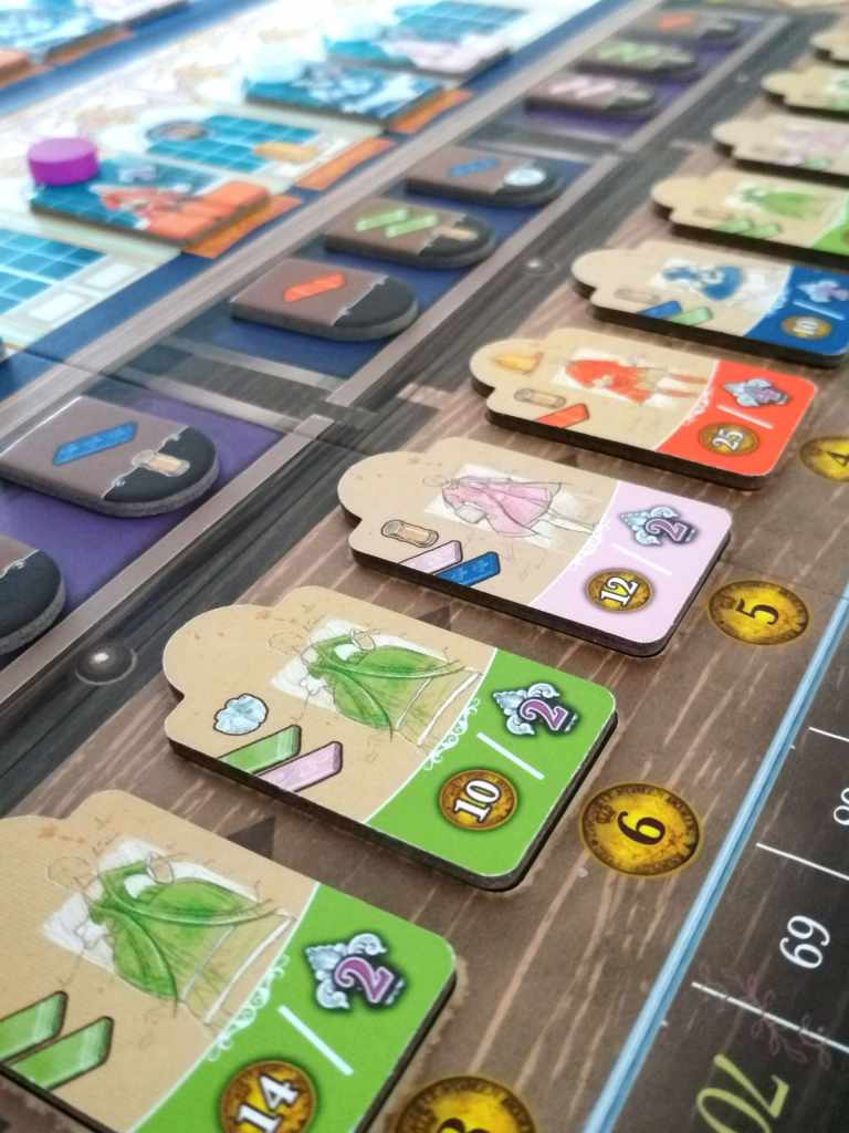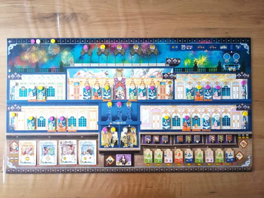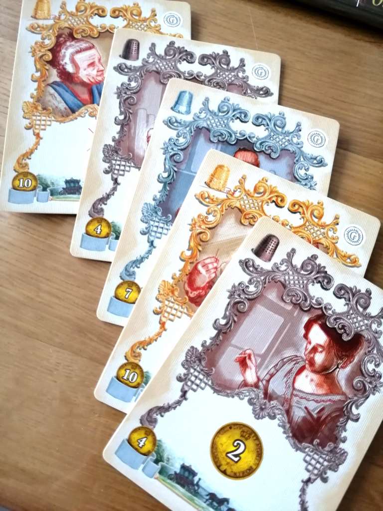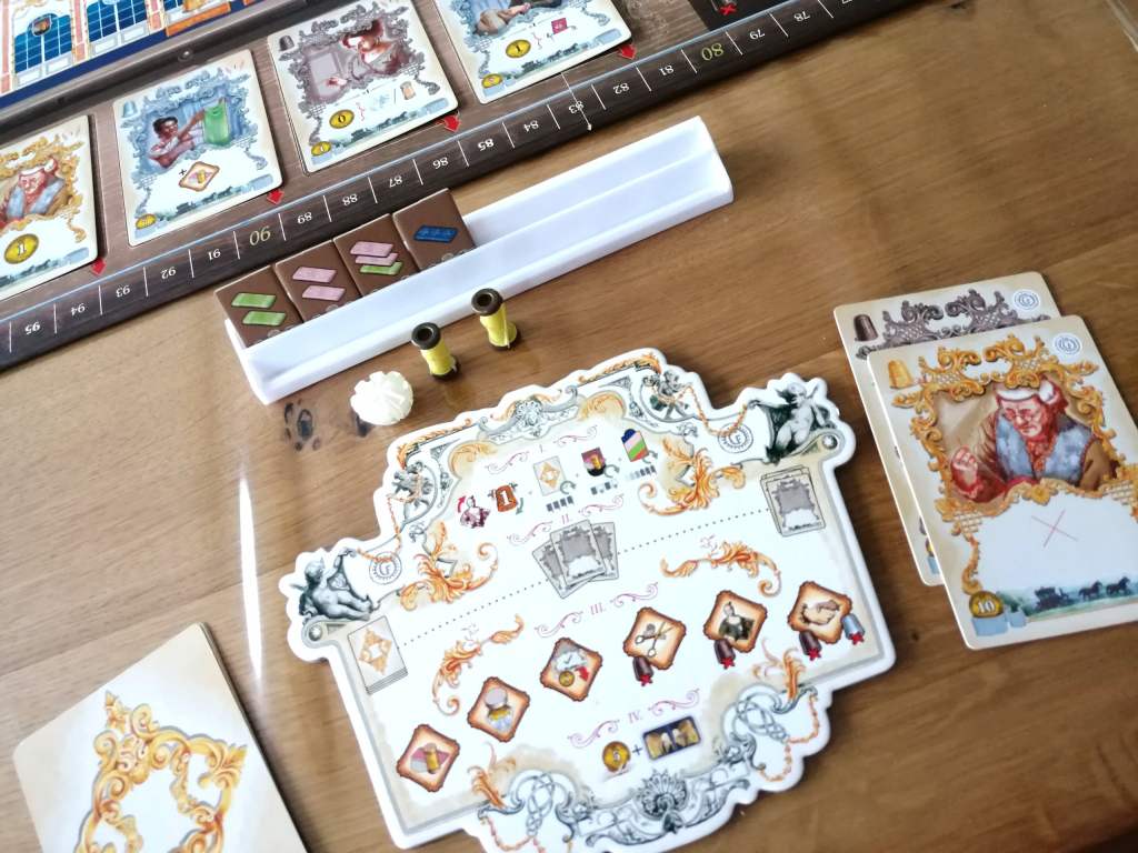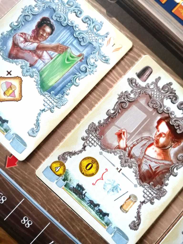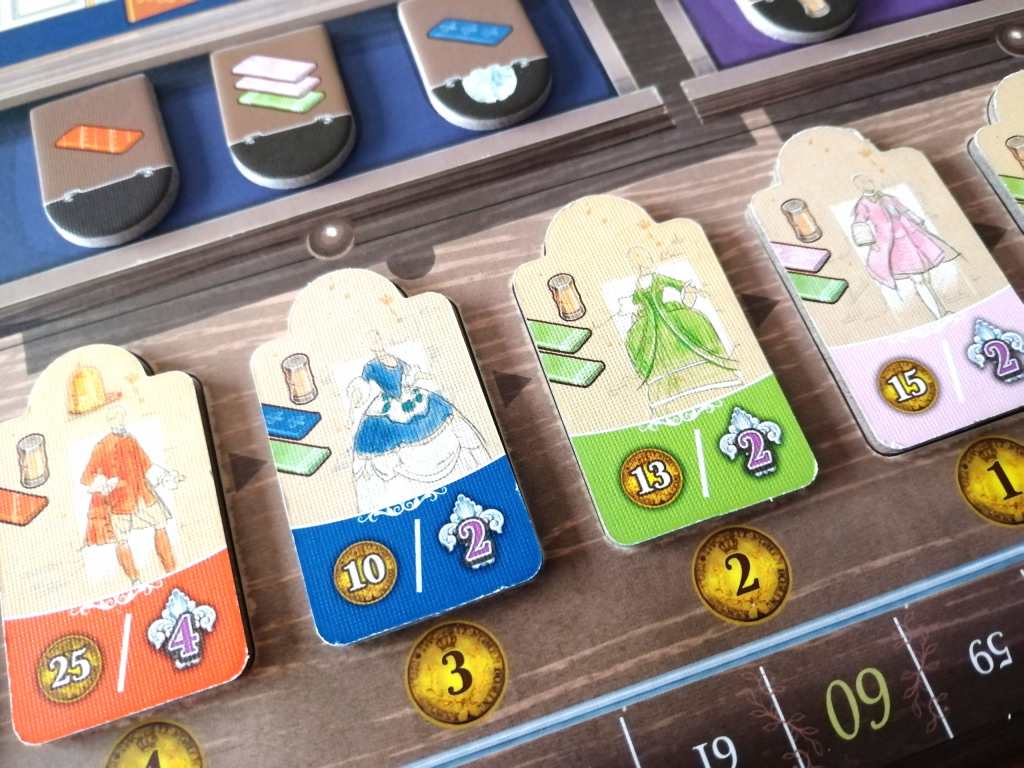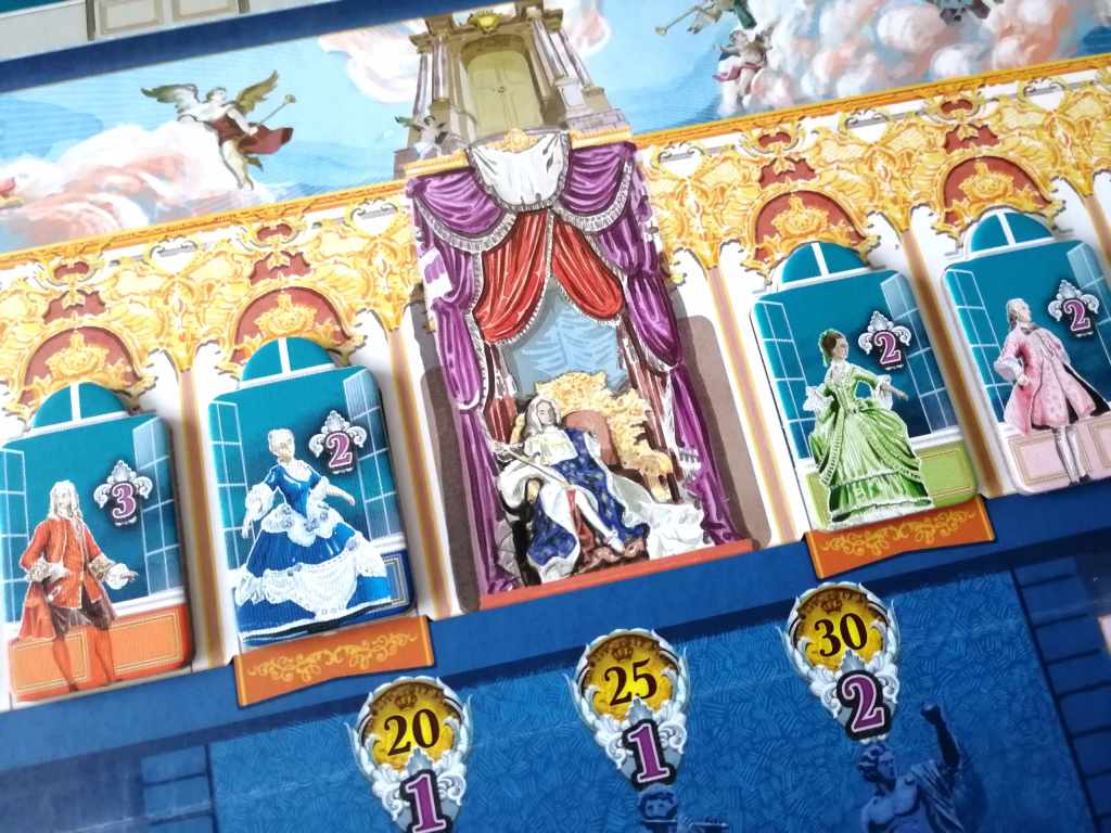 – Préparer une nouvelle manche. Le joueur ayant récupérer le jeton « faveur de la Reine » devient Premier Joueur et le repositionne sur le plateau. De nouvelles cartes « Commis » apparaissent, tout comme de nouvelles tuiles « Ressource » et « Tenue de Bal ».