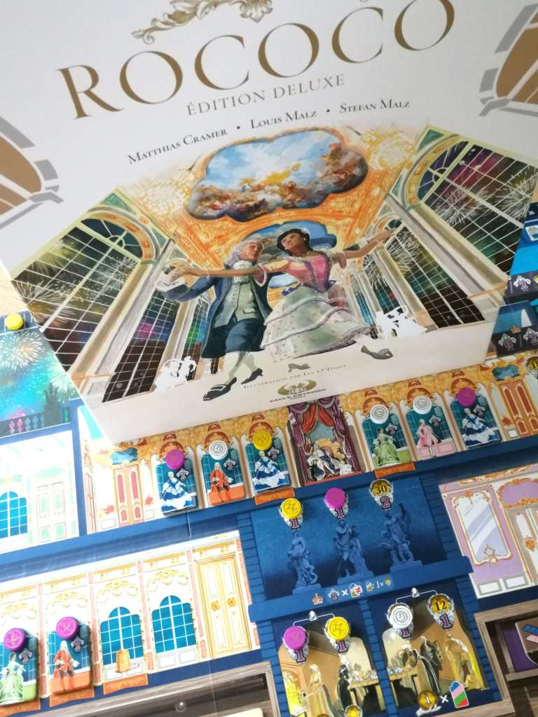 J’ai toujours été intriguée par l’édition d’origine « MAITRES COUTURIERS », et notamment par sa thématique de confection de « robes ». Dans un milieu où la plupart des thèmes des « gros » jeux se veulent plutôt masculins, traitant de « conquête spatiale », de « western » ou encore « d’invasion de zombies », il apparaissait rafraichissant, et affichait une sensibilité différente bienvenue. D’ailleurs, existe-t’il un lien entre cette prise de position, presque sociale voire politique, que je juge courageuse, et le semi-échec commercial du jeu ? Il faut bien avouer que de nombreux joueurs étaient loin de trouver sa thématique « sexy » alors qu’objectivement, elle l’est, et sans doute plus que la plupart de ce que proposent d’autres jeux « experts ». Quoi qu’il en soit, revoilà MAITRES COUTURIERS désormais renommé ROCOCO pour le plus grand plaisir du monde ludique. Le nom n’est pas le seul changement. Les illustrations sont devenues superbes alors qu’elles apparaissaient à l’époque sombres et peu attrayantes et le matériel est somptueux. Cette refonte visuelle donne au jeu une envergure et une élégance rare, qui nous fait immédiatement saisir notre code de carte bleue. A ce propos, cette nouvelle édition est proposée sous trois formats différents avec un prix minimum de 110 euros. Vous me direz que « quand on aime, on ne compte pas », certes, mais cela commence à faire beaucoup. Les rééditions de jeux « anciens » prennent aujourd’hui toutes le parti de mettre la totalité du contenu existant, « enrobée » dans une enveloppe en velours côtelé, pour des prix souvent exorbitants et prohibitifs. Je ne connais pas leurs impératifs, mais à titre personnel, j’aimerai avoir le choix du « all-inclusive » ou juste du « jeu de base » même si évidemment on peut choisir de le laisser en rayon… Venons-en au jeu car il le mérite vraiment ! Ma première partie fut d’ailleurs un véritable coup de foudre tant ROCOCO réunit tous les ingrédients à un jeu de gestion complet en incorporant un nombre de mécaniques ludiques phares et en proposant une modernité gigantesque dans un classicisme absolu. Rien n’est vraiment extrêmement novateur mais l’agencement de tous les éléments entre eux n’a pourtant jamais été vu ailleurs. ROCOCO demande avant tout de se construire une « main de cartes » efficace pour pouvoir réaliser des actions de plus en plus fortes le plus souvent possible et dans un timing subtil. Ce côté « deck-building » prend tout son sens dans le recrutement de « couturiers » plus ou moins « aguerris » allant du simple « Apprenti » jusqu’au « Maitre ». Ces différents ouvriers n’auront pas les mêmes capacités pour réaliser les actions, qui demanderont un certain niveau « d’expertise ». C’est un exemple parmi tant d’autres de la concrétisation parfaite du thème dans les mécaniques du jeu. En effet, ROCOCO est un des rares jeux de ce gabarit qui ne met jamais de côté sa thématique. Tout apparait de manière logique, ce qui d’ailleurs aide profondément à la compréhension des règles du jeu, devenant ainsi bien plus accessibles qu’elles n’y paraissent. Pourtant les options tactiques et stratégiques sont nombreuses pour arriver à se faire une place dans les nombreuses salles d’exposition. Car si ROCOCO permet de grappiller quelques points en cours de partie, c’est bien lors du décompte final que tout se joue avec l’objectif d’être majoritaire dans les différentes salles, d’où une tension omniprésente et des interactions bien présentes. Un décompte plutôt fastidieux qui n’enlèvera rien au plaisir ressenti durant l’ensemble de la partie. ROCOCO est un petit « bijou », à l’image du nom de l’une des extensions comprises dans cette boîte. Il impressionne par sa fluidité, sa profondeur, sa finesse et la complémentarité de tous les mécanismes qu’il associe brillamment dans un Bal Ludique Royal d’une grande élégance. ROCOCO entre de manière fracassante dans mon « Meep’Parade » des meilleurs jeux auxquels je joue et sur lesquels j’ai chroniqué.