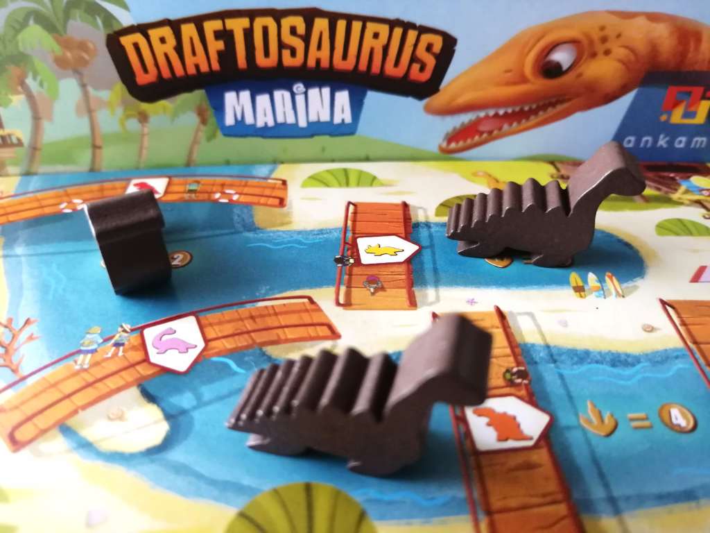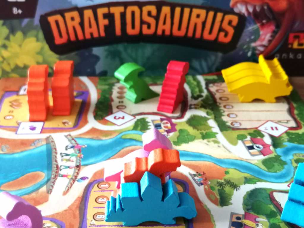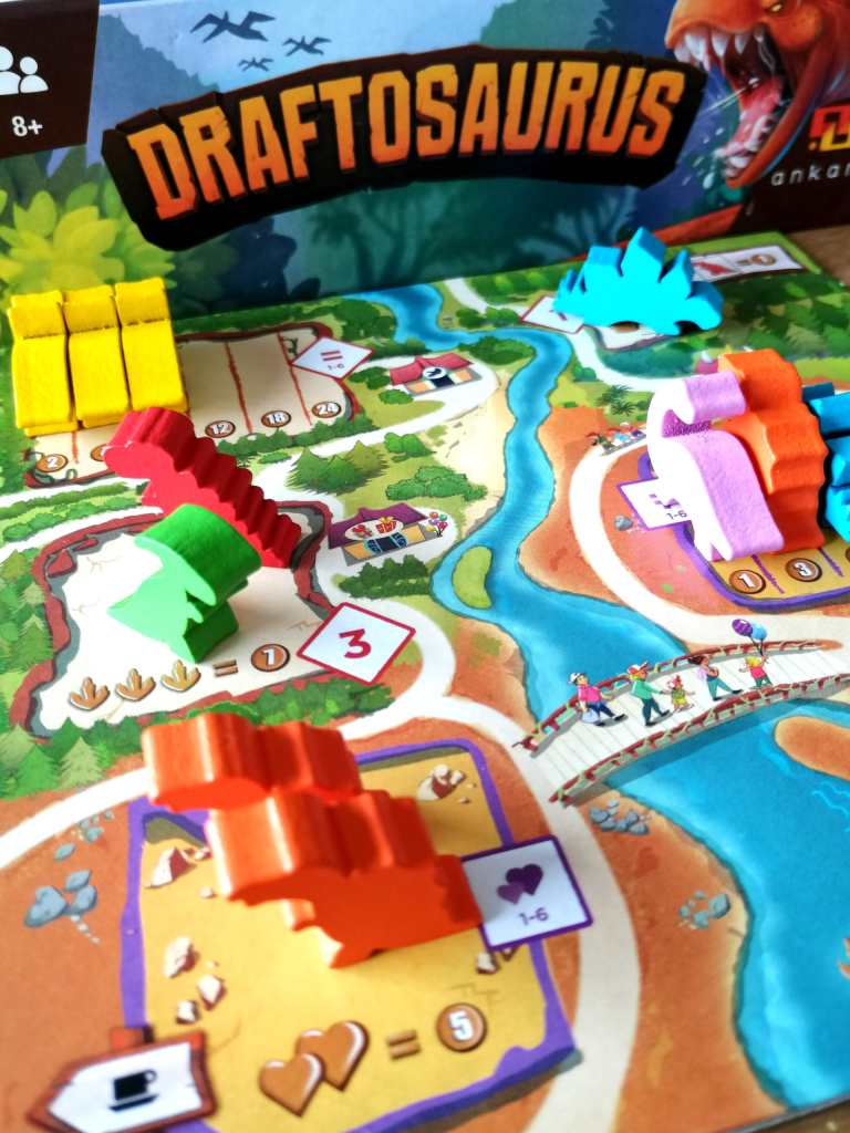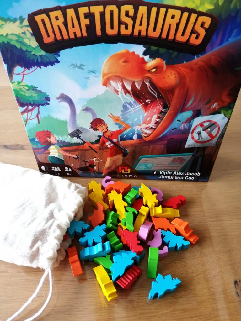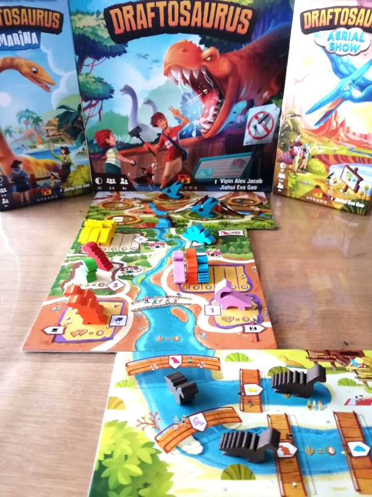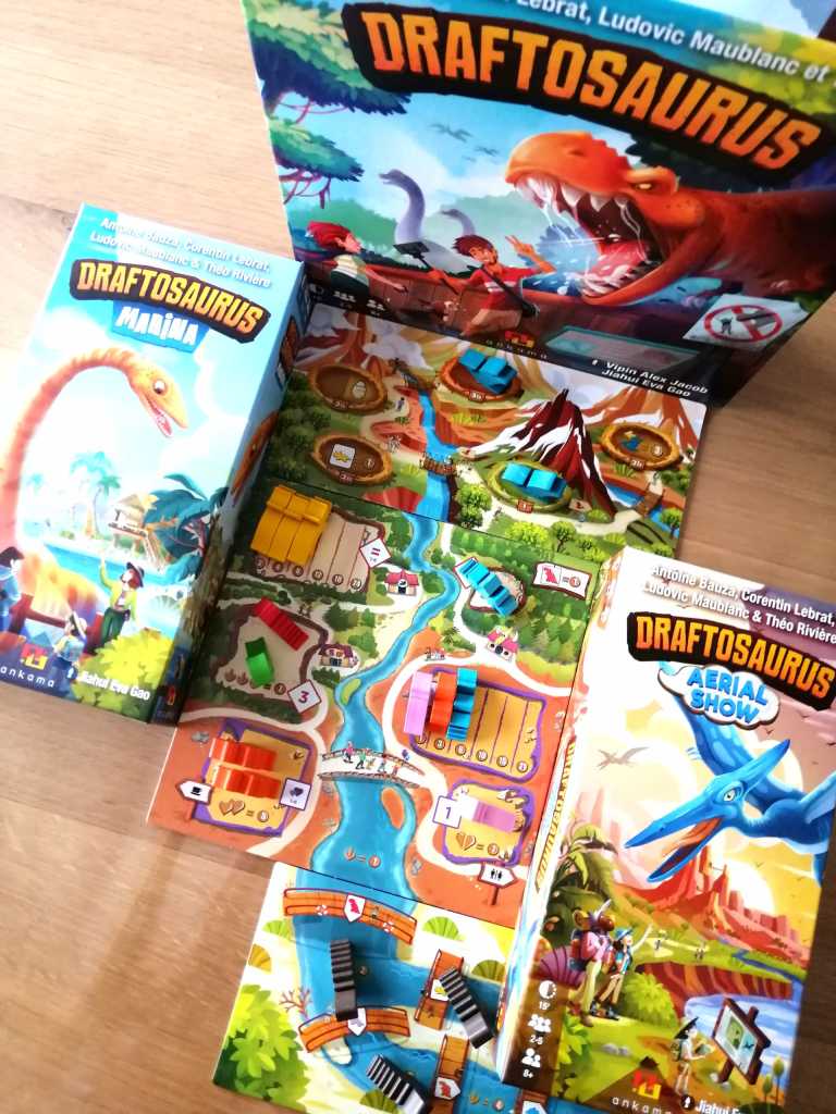 J’ai découvert DRAFTOSAURUS au Festival des Jeux de Cannes 2019 et ce fut un coup de cœur immédiat. Je suis d’ailleurs repartie avec sous le bras, séduite par son efficacité et sa simplicité, moi qui pourtant habituellement n’aime pas particulièrement la mécanique de « Draft » et suis attirée davantage par les jeux souvent plus profonds ou complexes. Le thème a beaucoup joué dans la séduction, tout comme son matériel, bien trop mignon pour ne pas complètement craquer. « Drafter » des « meeples » en forme de dinosaures pour les placer dans notre Zoo en moins d’une minute d’explications et de quinze minutes de jeu, il faut bien avouer que l’idée, sans être vraiment originale, est canon ! Les tours de jeu s’enchainent avec une fluidité et un dynamisme vraiment très agréable. DRAFTOSAURUS fait surtout partie de ces jeux « plusieurs lectures » permettant de jouer de manière légère et insouciante ou de faire des choix plus tactiques en observant les actions adverses et en mémorisant les contenus des « mains » de dinosaures qui nous passent sous le nez. Des mains qui d’ailleurs seront remplacées rapidement par des gobelets si l’on veut garder un minimum de confidentialité dans les dinosaures qui nous arrivent. La manipulation est difficile voire impossible pour des enfants, qui pourtant semble être la principale cible accompagnés de leurs parents qui prendront part avec beaucoup de plaisir aux différentes parties. En effet DRAFTOSAURUS est extrêmement bien pensé pour réunir autour de la table les familles entières. Les parties sont courtes, dynamiques donnant souvent des résultats tendus et proposant une sensation de fraicheur par une mécanique d’initiation au « draft » épurée et maligne. Les nombreuses façons de « scorer » dans les enclos orientent les choix des joueurs, et occupent toutes leurs pensées, tout comme la contrainte imposée par le lancer de dé. Et même si sa mécanique de « draft » laisserait à penser qu’il s’adresse à des joueurs aguerris, DRAFTAUSORUS est avant tout et sans prétention un jeu familial d’une efficacité redoutable. Il faut le considérer pour ce qu’il est et non pour ce que les joueurs « experts » auraient désiré de lui, à en lire certaines critiques négatives. Cela dit, les deux extensions venant s’ajouter dernièrement au jeu de base, lui donne une consistance un peu plus marquée en ajoutant des possibilités tactiques intéressantes, et permettant ainsi des choix plus déterminants et exigeants. En effet, que ce soit par les « Bonus » débloqués des « Ptérodactyles » ou dans l’avancée des « Plésiosaures » dans la rivière, les joueurs auront davantage intérêt à considérer leur Zoo comme un tout, dans lequel certains enclos et dinosaures interagissent avec d’autres, pour au final obtenir des points de victoire supplémentaires. Le choix des dinosaures devient donc encore plus dépendant de la présence d’autres dans certains enclos. Ainsi, l’opportunisme toujours présent, s’oriente doucement vers une stratégie légère sur le long terme plus consciente. De plus, la rejouabilité légèrement étriquée du jeu de base, est assurée ici par la possibilité de jouer sur les rectos et versos des trois plateaux et de les associer entre eux différemment à chaque partie. DRAFTOSAURUS est un excellent jeu et ses extensions viennent renforcer ses très agréables sensations , varier les plaisirs, et apporter des choix plus délicats tout en conservant l’essentiel, c’est à dire sa grande accessibilité et son « fun ».